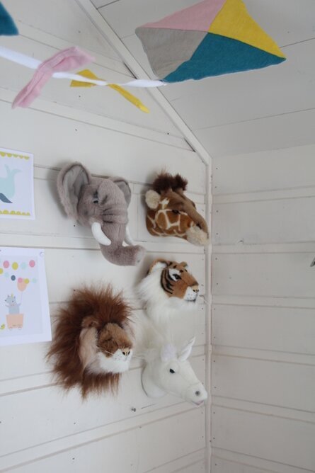 På väggens övre vänstra del syns några barnteckningar uppsatta, vilket förstärker rummets lekfulla och kreativa atmosfär. Dessa färgglada teckningar har motiv av ballonger och blommor, och de harmoniserar väl med de mjuka djurhuvudena. Hängande från taket finns också geometriska tygdekorationer i olika färger som blått, rosa och gult, vilket ytterligare förhöjer den glada och inspirerande stämningen i rummet.