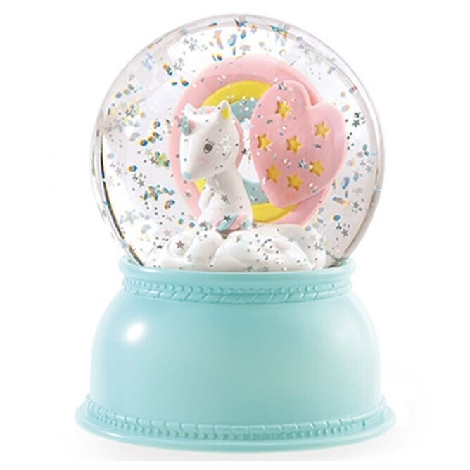 Bilden visar en förtjusande nattlampa i form av en snöglob från varumärket Brigbys, tillgänglig hos Köpstaden.se. Nattlampan Enhörning fångar uppmärksamheten med sin unika design och pastellfärgade detaljer. Den har en robust bas i en mild turkos nyans, som ger ett stabilt intryck och bidrar till dess praktiska användning som nattlampa.