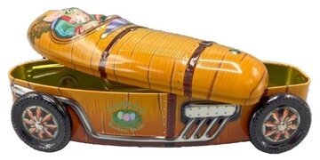 Bilden från Köpstaden.se visar en charmig och detaljrik plåtburk, känd som Rabbit Racer Boy, från varumärket Bromma Kortförlag. Denna plåtprodukt är formad som en gammaldags racerbil, vilket ger den en lekfull och unik känsla. Karossen har en livfull orange färg som påminner om vintageracerbilar från tidigt 1900-tal.