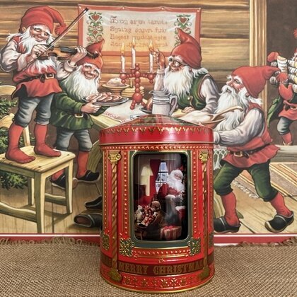 Bilden visar en plåtburk med speldosa från Bromma Kortförlag, med en charmig julscen som skapar en varm och nostalgisk känsla. Vid en första anblick ser vi att burken har en rik, röd färg med detaljer i guld och grönt. Dekoren består av intrikata mönster och julmotiv, vilket för tankarna till traditionella julkort och äldre jular.