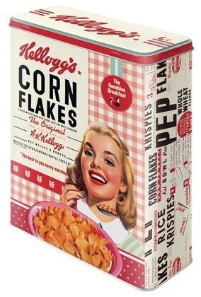 Framsidan av plåtburken är dekorerad med en vintage-inspirerad reklam för Kellogs cornflakes. Det finns en skål med majsflingor i förgrunden, som bidrar med en rik orange ton som bryter av mot bakgrundens pastellfärger och ger bilden extra liv. Designens färgpalett inkluderar varma toner i rött och rosa, vilket harmoniskt matchar den glada och inbjudande stämningen som motivet förmedlar.