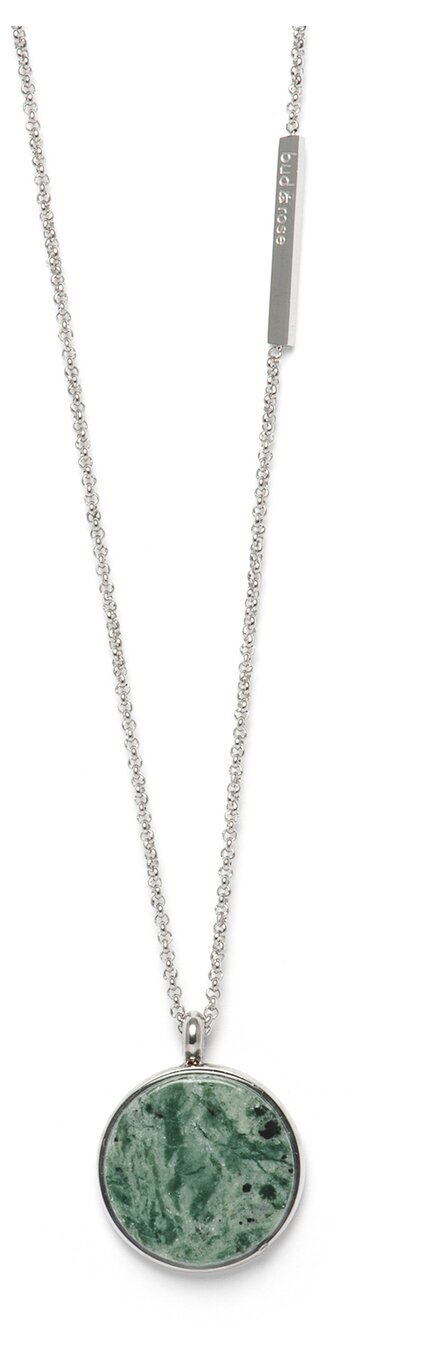 På bilden syns ett elegant halsband från varumärket Bud to Rose, tillgängligt hos Köpstaden.se. Halsbandet, som kallas Rock Steel/Green, fångar uppmärksamheten med sitt distinkta utseende och unika design.