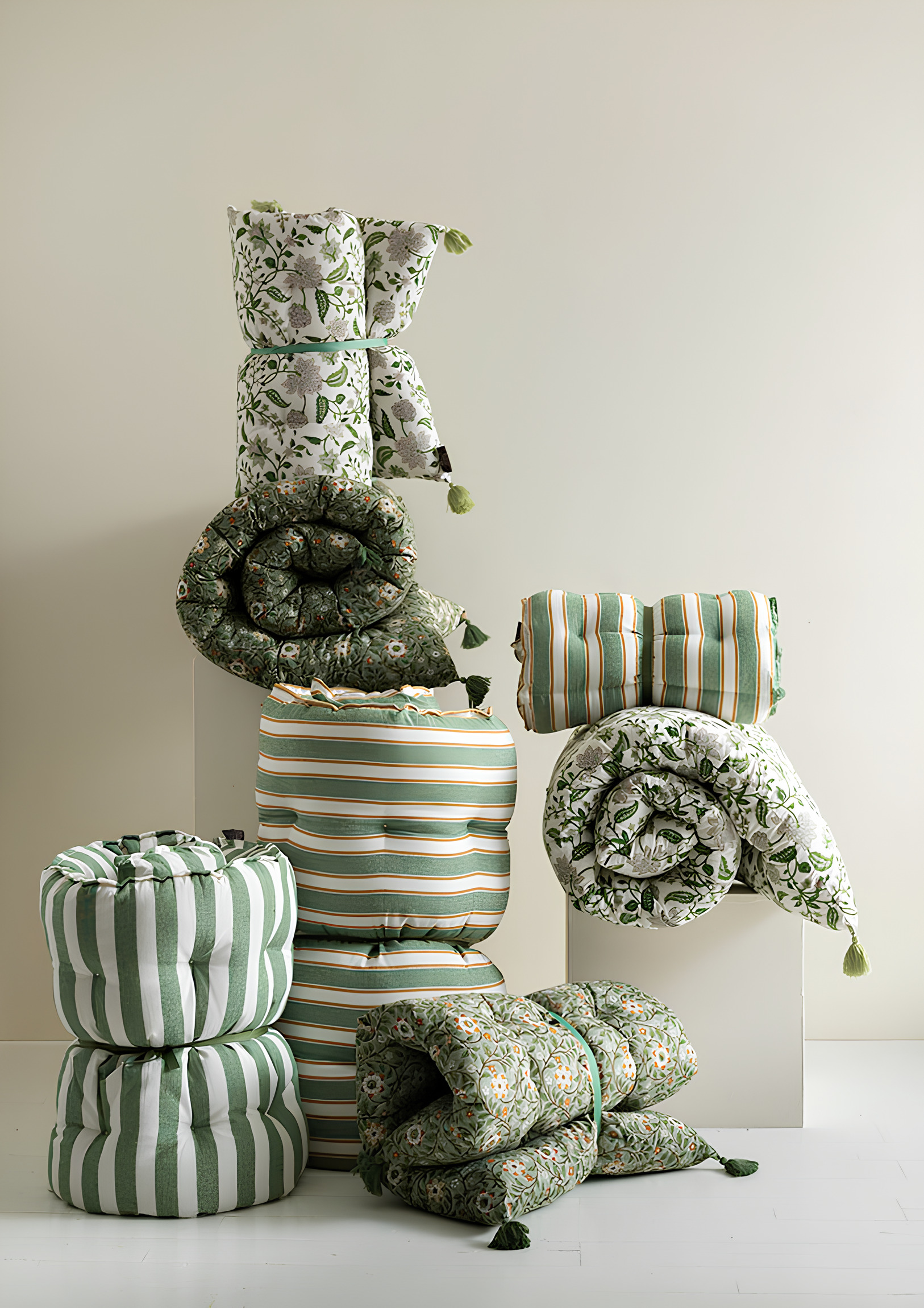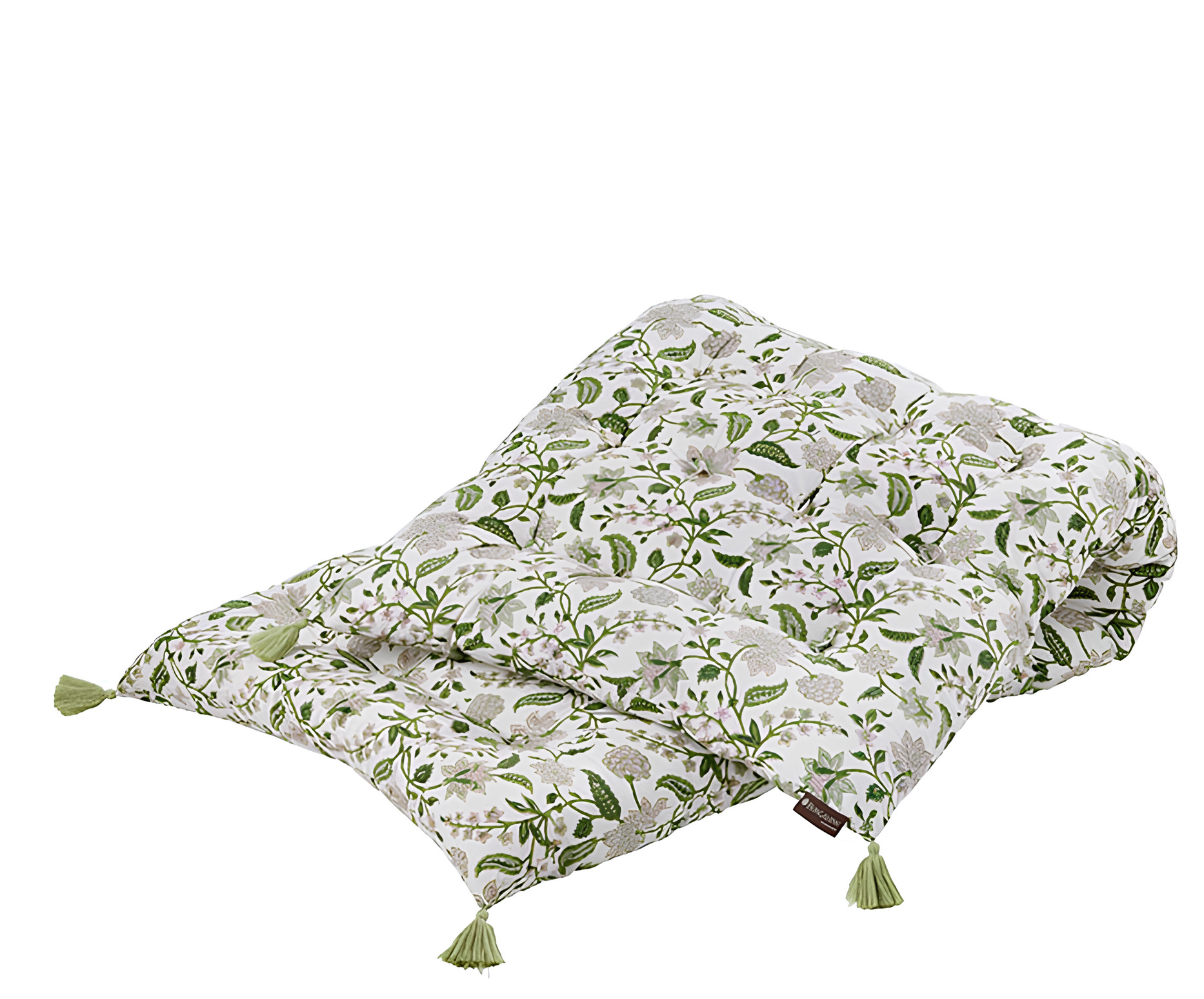Överdraget är tillverkat i 100 % bomull med handgjort blocktryck, vilket gör varje madrass unik med sin egen karaktär. Små variationer i färg och detaljer är en del av det hantverksmässiga uttrycket. Fyllningen består av 100 % återvunnen polyester.
