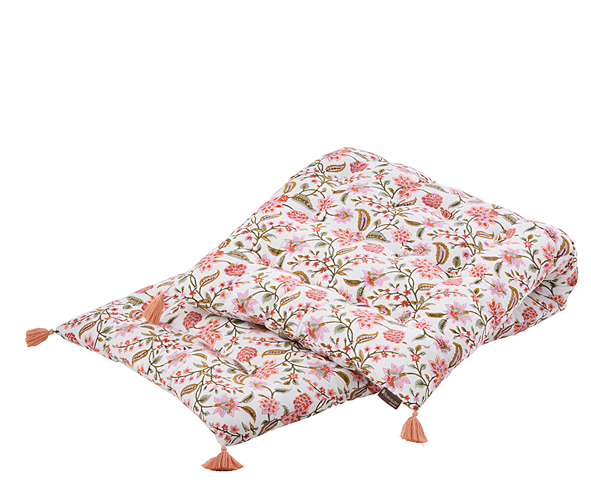 Överdraget är tillverkat i 100 % bomull med handgjort blocktryck, vilket gör varje madrass unik med sin egen karaktär. Små variationer i färg och detaljer är en del av det hantverksmässiga uttrycket. Fyllningen består av 100 % återvunnen polyester.