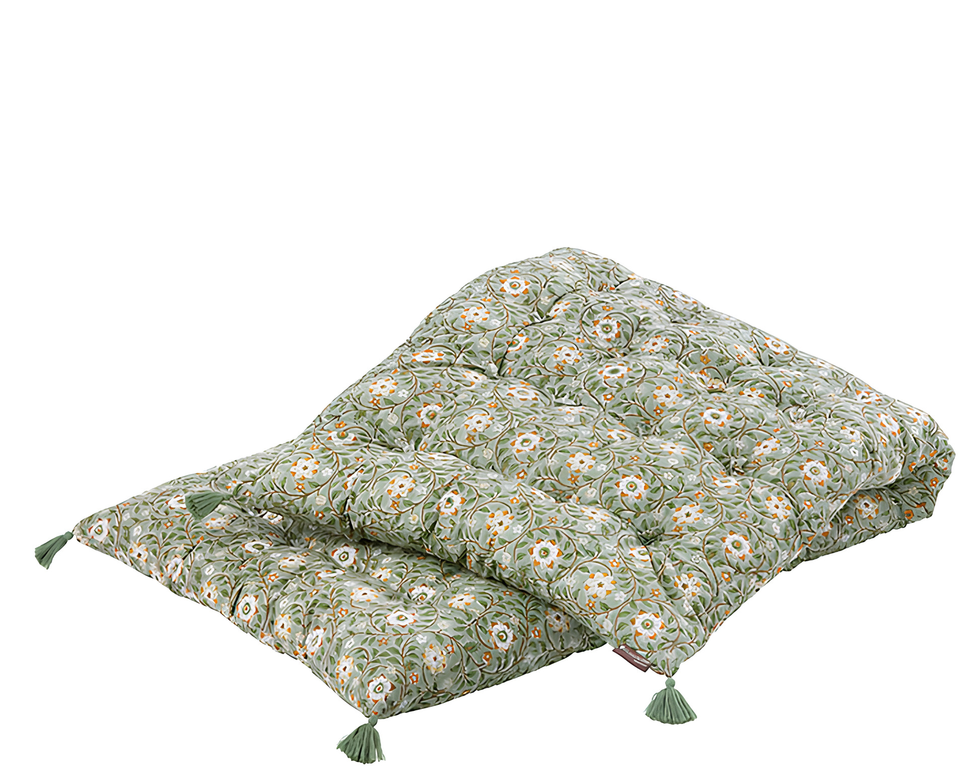 Överdraget är tillverkat i 100 % bomull med handgjort blocktryck, vilket gör varje madrass unik med sin egen karaktär. Små variationer i färg och detaljer är en del av det hantverksmässiga uttrycket. Fyllningen består av 100 % återvunnen polyester.
