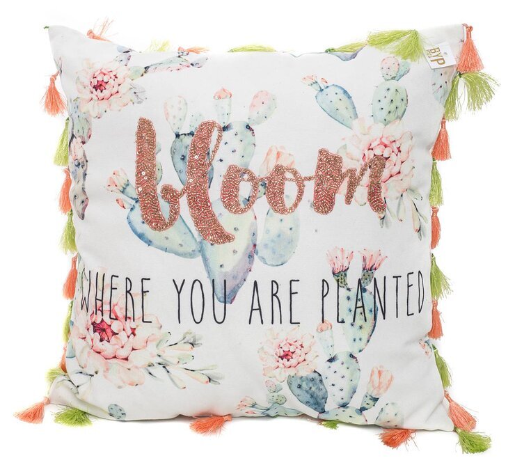 Centralt på kudden finns det ett broderat ord, “bloom,” som är tydligt markerat i glittrande, kopparfärgad text. Detta ger kudden en tredimensionell känsla och skapar en intressant kontrast till det mer subtila bakgrundsmönstret. Under det dekorativa ordet står texten “WHERE YOU ARE PLANTED” i svarta, versala bokstäver, vilket ger en motiverande och positiv känsla.
