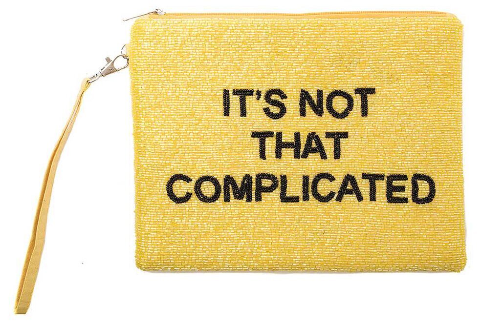 På väskans framsida finns ett tydligt budskap av texten "IT'S NOT THAT COMPLICATED", skrivet i svarta bokstäver. Orden är arrangerade i tre rader, vilket ger ett balanserat intryck som är lätt att läsa. De svarta bokstäverna kontrasterar starkt mot den gula bakgrunden, vilket ger texten en stark visuell närvaro.