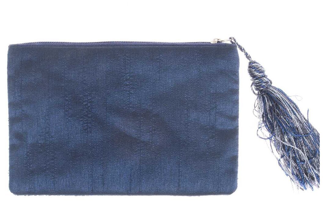 En av de mest framträdande detaljerna är den stora tofsen som hänger på sidan av väskan. Tofsen är tätt knuten och består av trådar i olika nyanser av blått, vilket ger ett lekfullt men samtidigt elegant intryck. Denna detalj förstärker väskans uttryck och ger en extra dimension till dess övergripande estetik.