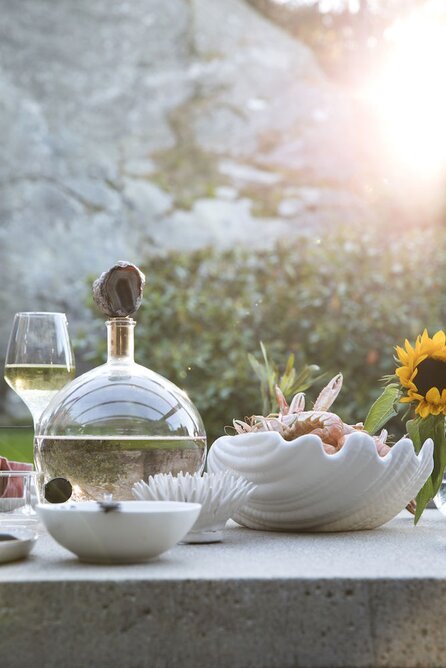 Runt den centrala skålen finns en välvald och smakfull uppsättning detaljer. Till vänster syns ett elegant glas fyllt med vitt vin, vars gyllene ton fångar och reflekterar ljuset på ett inbjudande sätt. Bredvid glaset står en karaktäristisk vinskara av glas med en kork, fylld med samma dryck som i glaset, vilket förstärker känslan av en njutbar och avslappnad stund i det fria.