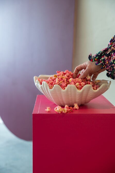 I skålen ligger rosa och gula popcorn, som ser ut att vara smaksatta. Popcornens färg bryter av mot skålens vita yta och förstärker dess unika form ytterligare. Några popcorn har vält ut ur skålen och ligger utspridda på podiet, vilket ger en känsla av rörelse och liv i bilden.