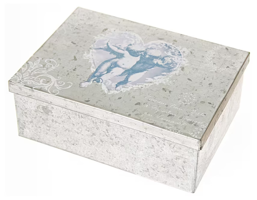 Det som genast fångar blicken är det dekorativa elementet på locket. Här ser vi en bild av en kerub, innesluten i en hjärtformad design. Keruben, avbildad i blå toner, ger en klassisk touch till lådans övergripande look. Runt bilden finns ytterligare grafiska detaljer, bland annat eleganta, vita ornament som slingrar sig likt vinrankor över ytan.