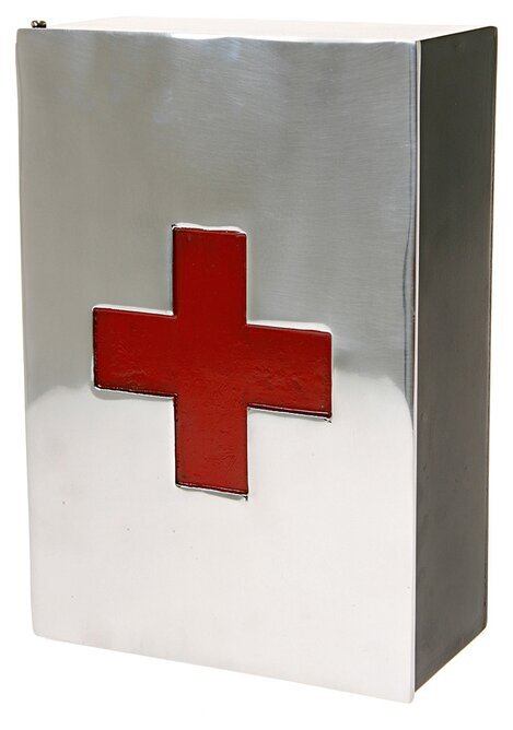 Skåpet har en rektangulär form med raka kanter och en slät framsida. På dörren finns ett distinkt rött kors, en klassisk symbol för sjukvård och första hjälpen. Korset kontrasterar mot den silvriga metallen, vilket gör det enkelt att känna igen även på avstånd. Denna framträdande detalj bidrar både till funktion och estetik.