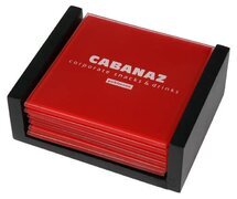 På varje underlägg ser vi tydligt Cabanaz-logotypen, vilket ger produkten en självklar identitet och signalerar kvalitet. Logotypens färg står ut mot den röda bakgrunden, vilket gör den lättläst och framträdande utan att dominera den visuella upplevelsen.
