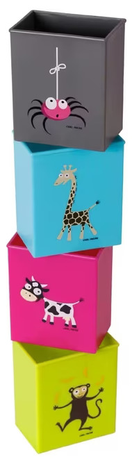 Bilden från Köpstaden.se visar en produkt från varumärket Carl Oscar – en tetrahållare i ett 4-pack. Dessa hållare är formade som fyrkantiga behållare, staplade på varandra i en vertikal linje. Varje behållare är av en distinkt färg och bär en charmig illustration av olika djur, som tillför ett lekfullt och pedagogiskt element till föremålet.