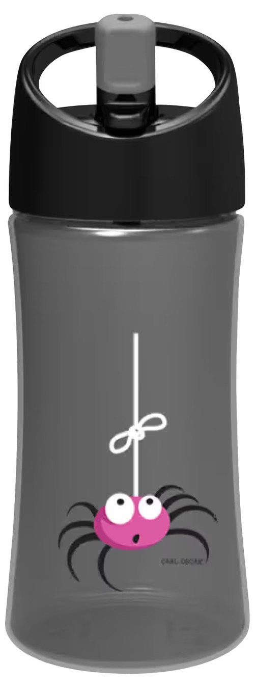 Formen på denna vattenflaska är flöjande cylinderformad, vilket ger en bekväm greppbarhet. Det genomskinliga gråa materialet ger en smidig överblick av innehållet, och bidrar samtidigt till flaskans distinkta utseende. På flaskans framsida finns en lekfull illustration av en rosa spindel, som hänger i en vit tråd. Dess stora, vita ögon och den enkla, grafiska stilen ger flaskan en unik och tilltalande design. Spindeln tillför en ungdomlig touch, vilket gör att flaskan lätt uppskattas av både barn och vuxna.