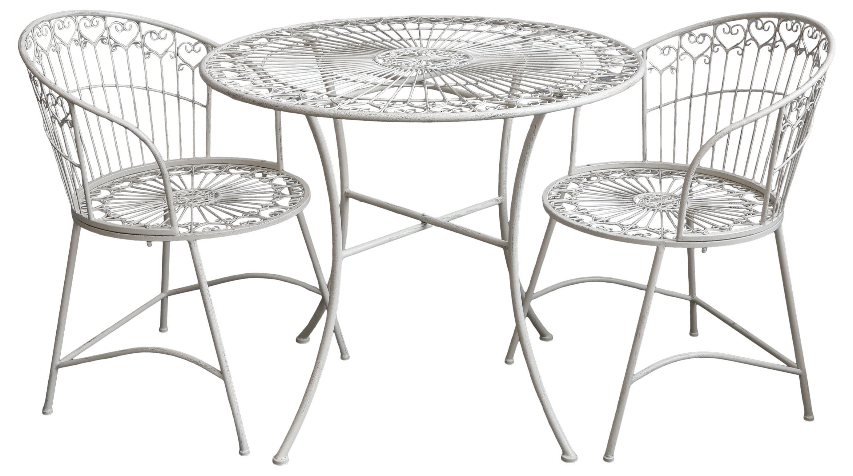 Bilden visar ett smakfullt och detaljrikt caféset vid namn Caféset Antique Creme från varumärket Chic Antique, tillgängligt hos Köpstaden.se. Setet består av ett runt bord och två matchande stolar, som är tillverkade i lätt och stabilt metallmaterial i en subtil, krämfärgad nyans. Bordsskivan har ett intrikat hålmönster som strålar ut från mitten mot kanterna, vilket ger en luftig känsla som kompletterar den dekorativa stilen.