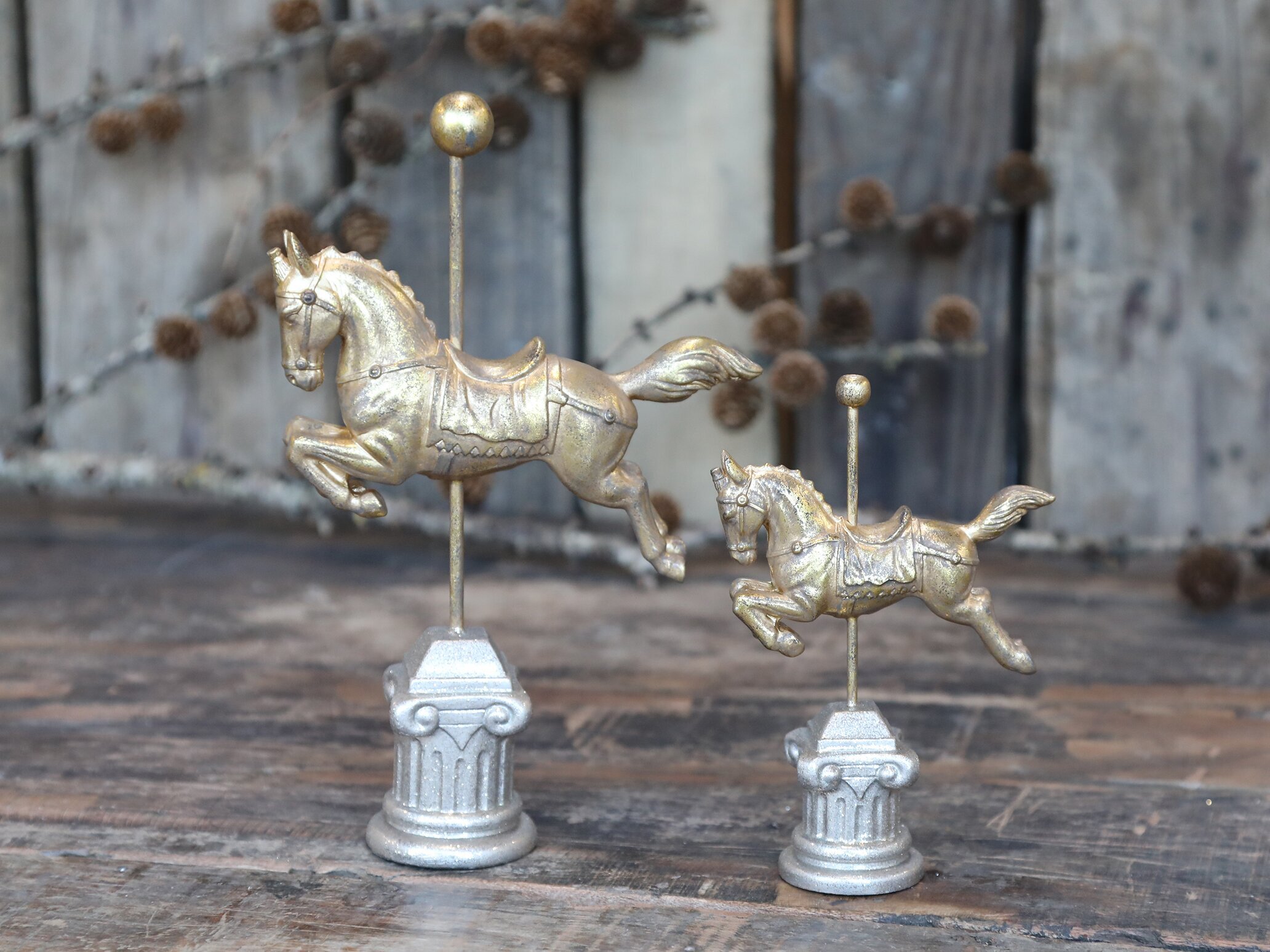 Cirkushäst i antik guld, en vacker juldekoration som kan användas år efter år. Finns i flera olika storlekar.