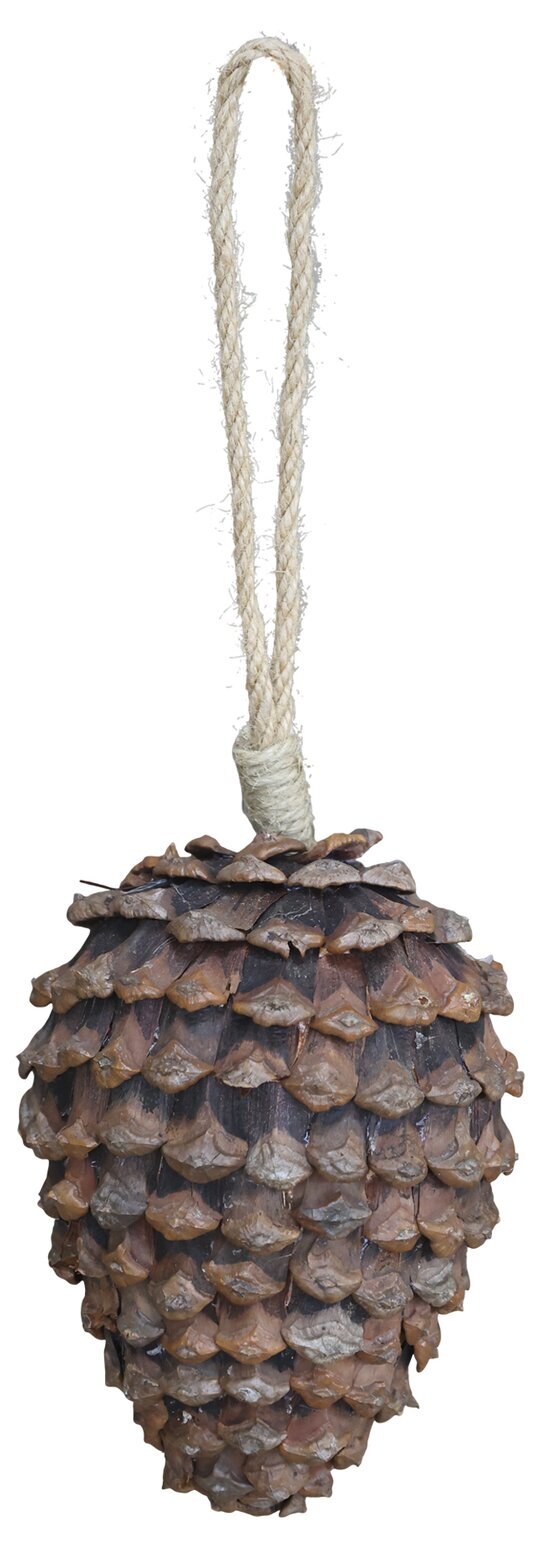 På bilden ser vi ett dekorativt hänge som finns hos Köpstaden.se, känt som Dekorationshänge Kotte från varumärket Chic Antique. Hänget är designat för att efterlikna en traditionell kotte med sin realistiska struktur och naturliga färgpalett. Ytan är ojämn med individuella, skal-liknande upphöjningar som liknar kottefjäll. Dessa fjäll har en blandning av jordnära nyanser, där brunt dominerar men små skiftningar i grått och beige ger ett livfullt uttryck. Detta skapar en variation och djup som fångar ögat.
