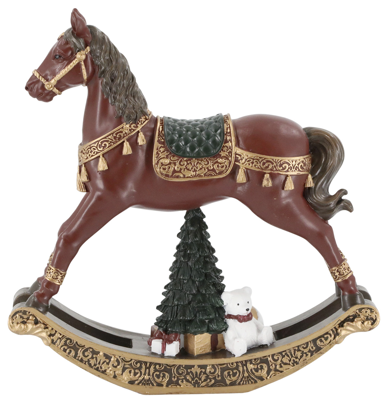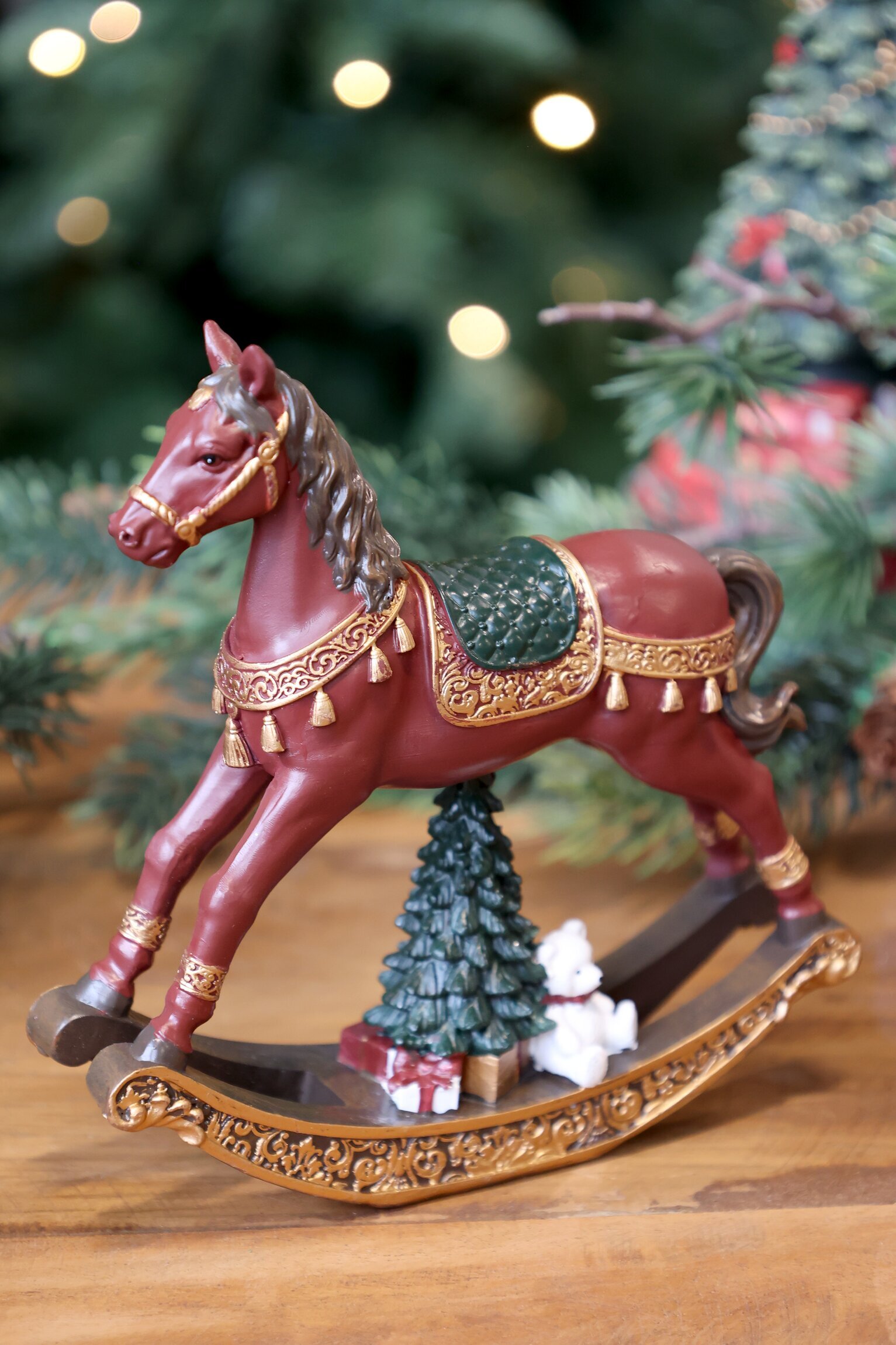 En charmig gunghäst som verkligen fångar den där härliga, nostalgiska julkänslan. Den mörkröda färgen tillsammans med gulddetaljerna och den gröna sadeln gör den till en riktig blickfångare. Under hästen hittar du små fina detaljer – en gran, inslagna paket och en söt liten björn – som gör att den känns extra levande och stämningsfull.