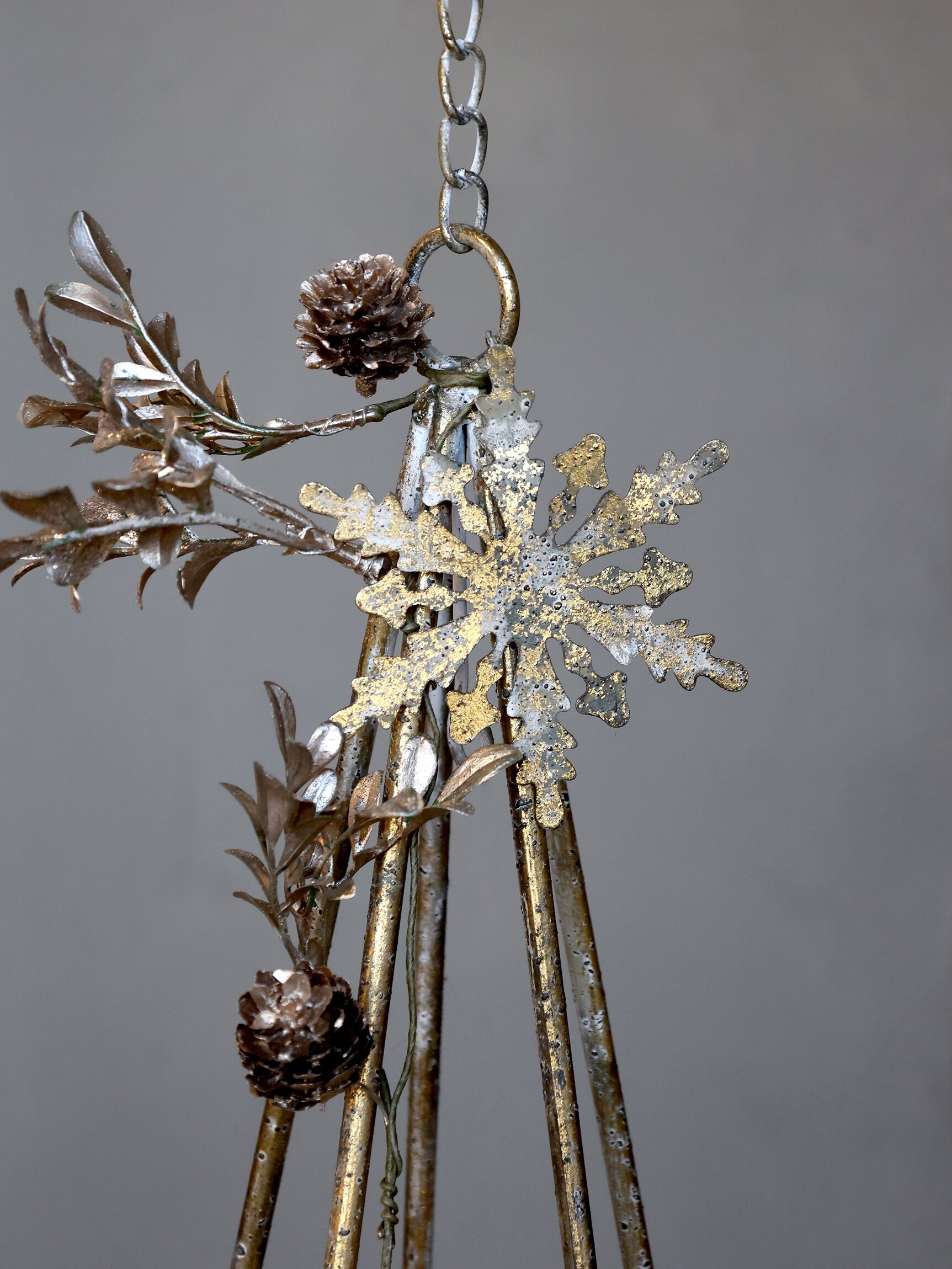 Den gyllene ytan med lätt patinerad känsla ger ett charmigt uttryck, och upptill pryds granen av en gnistrande snöstjärna som krona. Perfekt att hänga i ett fönster, i ett hörn av rummet eller över ett vackert dukat bord.