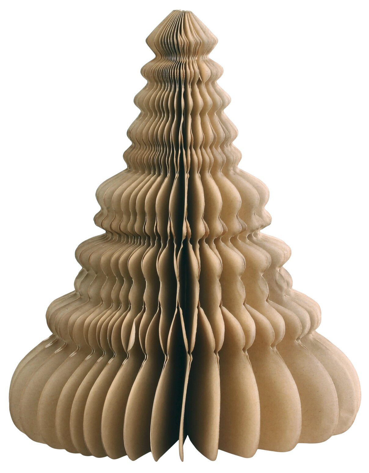 Julgranen består av ett flertal skickligt vikta papperslager som tillsammans bildar en tredimensionell struktur. Varje lager viks noggrant för att skapa en symmetrisk och harmonisk form som är både tilltalande och intressant från alla vinklar. Formen av granen är traditionellt konisk, med bredare bas som smalnar av mot en spets på toppen. Detta ger en subtil känsla av höjd och volym, vilket kan bidra till att framhäva inredningen där den placeras.