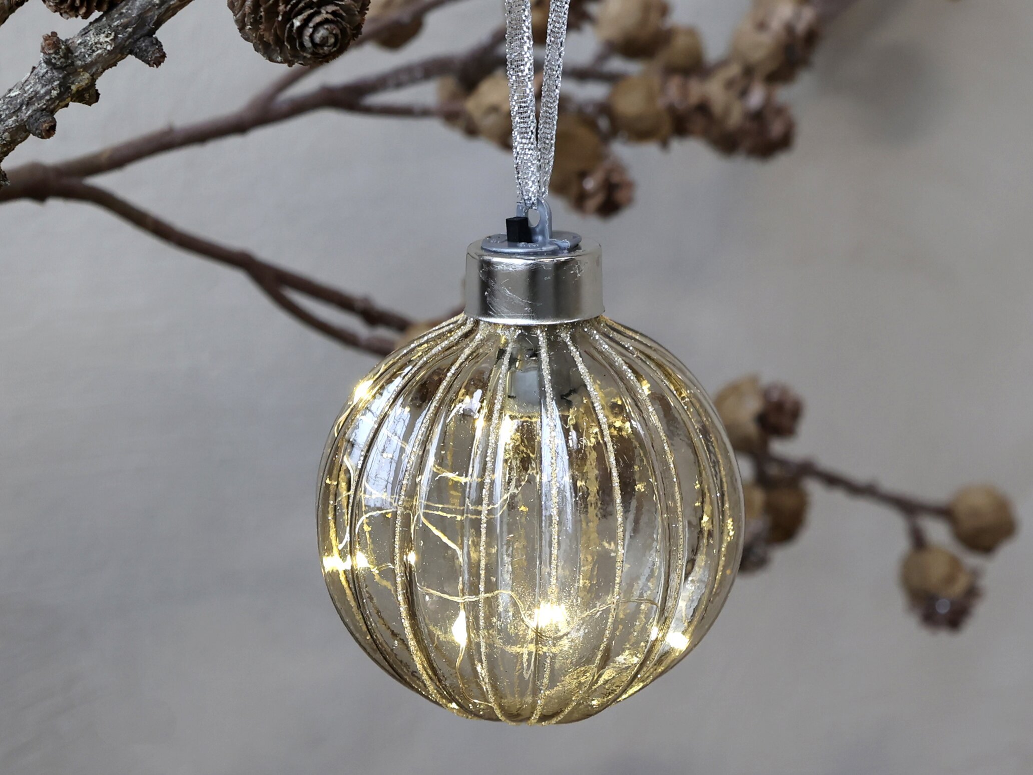 Bilden visar en dekorativ julkula från varumärket Chic Antique, tillgänglig via den mångsidiga butiken Köpstaden.se. Denna julkula, känd som Glitter LED, är elegant utformad för att tillföra ett strålande ljusinslag i varje juldekoration.