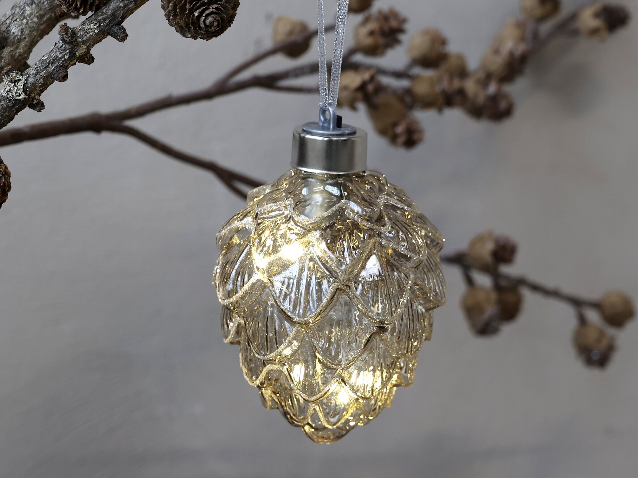 Ovanpå julkulan sitter ett litet, silverfärgat lock med en elegant design som håller ihop hela arrangemanget och betraktaren kan se den robusta snören som harmoniskt balanserar kulan från en gren. Den hängande placeringen mot en subtil bakgrund av grenverk och torra fröskal skapar en kontrast mellan den glittrande ytan och naturens råa element. Detta ger känslan av att kulan är i en naturlig miljö, som om den försiktigt hängts på en vintertskog.