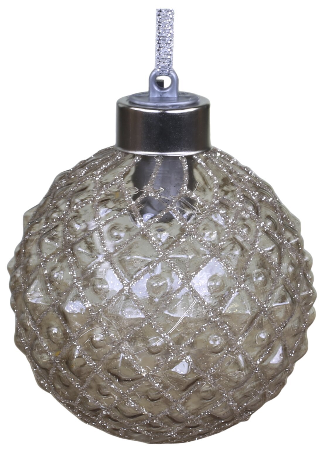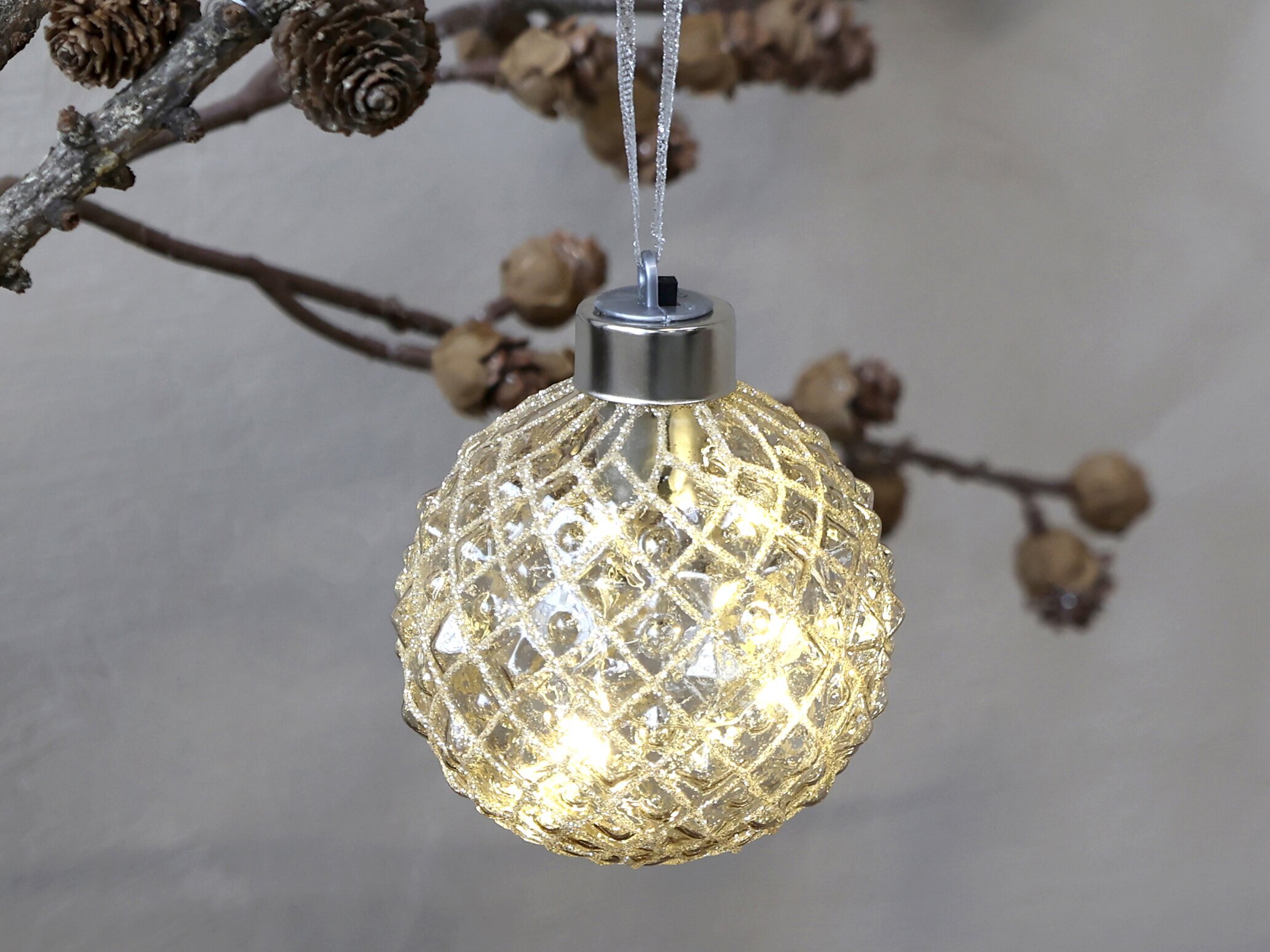 Elegant & vacker julkula med medföljande LED, finns i flera olika varianter fina att matchas tillsammans. Julkulan drivs av 3 stycken batterier LR44 som medföljer & som sedan enkelt kan bytas ut på toppen av kulan när det behövs. On/off-knapp finns på ovansidan.