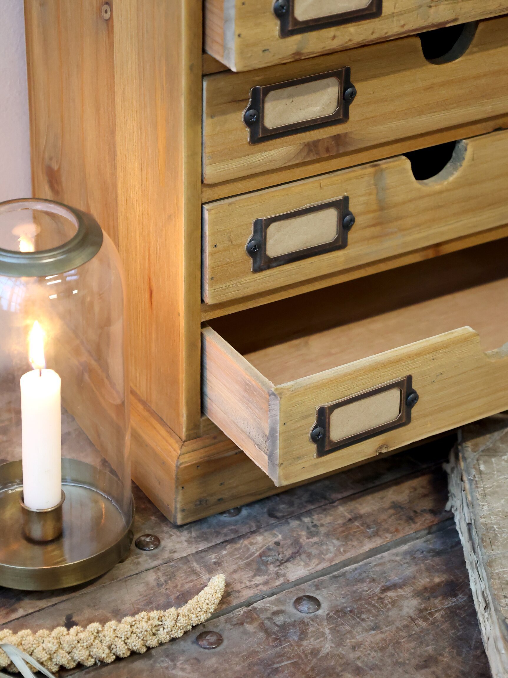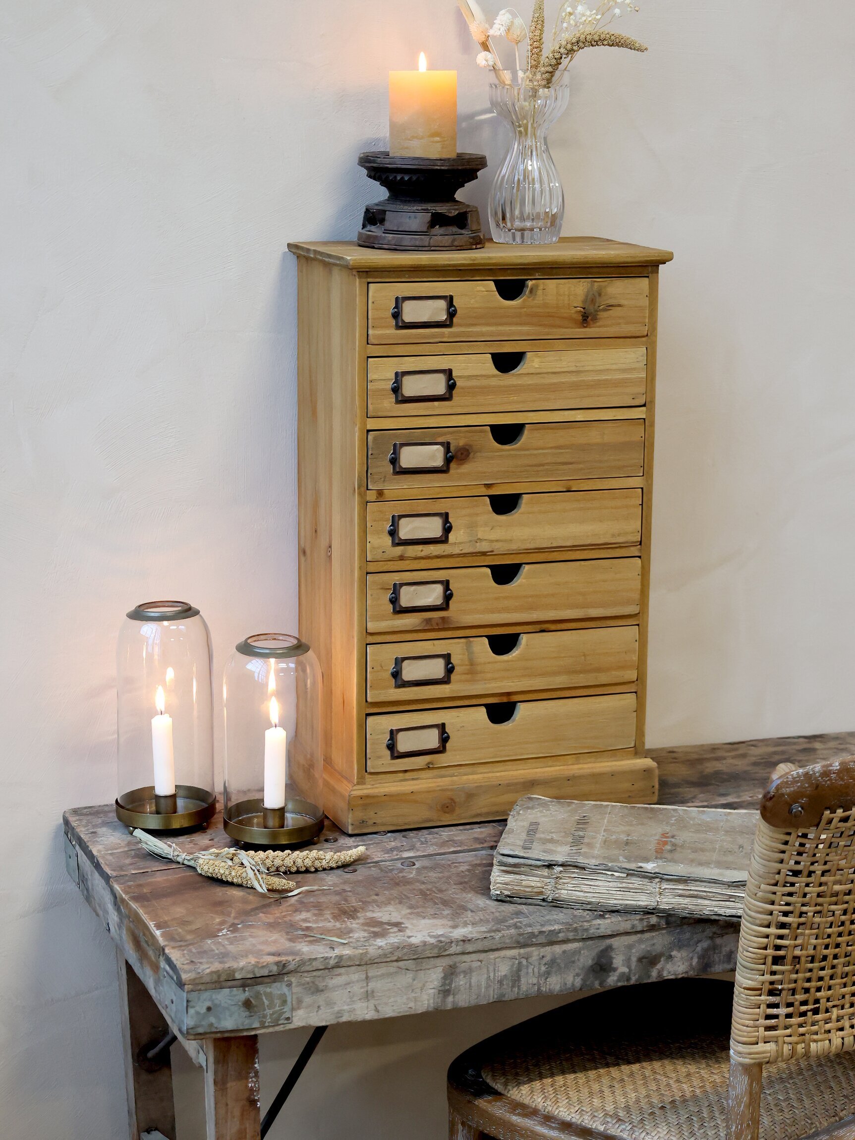 Liten träbyrå med 7 stycken lådor, passar fint till hemmakontoret eller kanske till kökets recept. Från Chic Antique.
