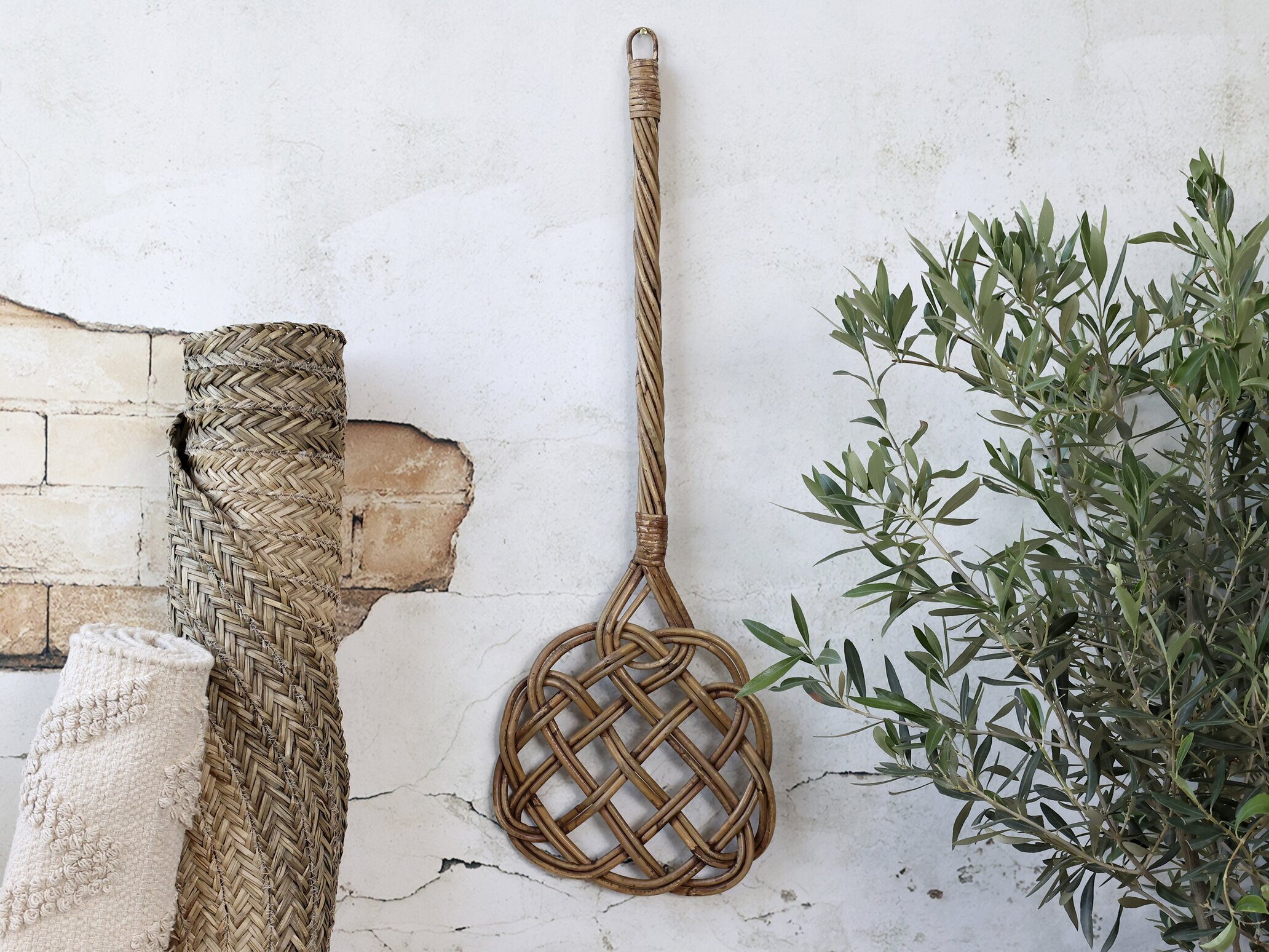 Mattpiska Rotting Natur är placerad i mitten och hänger vertikalt från en krok på väggen. Den är tillverkad av rotting, ett material som både är naturligt och hållbart. Den har en flätad design som formar en cirkulär platta i botten, vilket är karakteristiskt för traditionella mattpiskor. Denna stilfulla konstruktion ger föremålet en nostalgisk anstrykning.