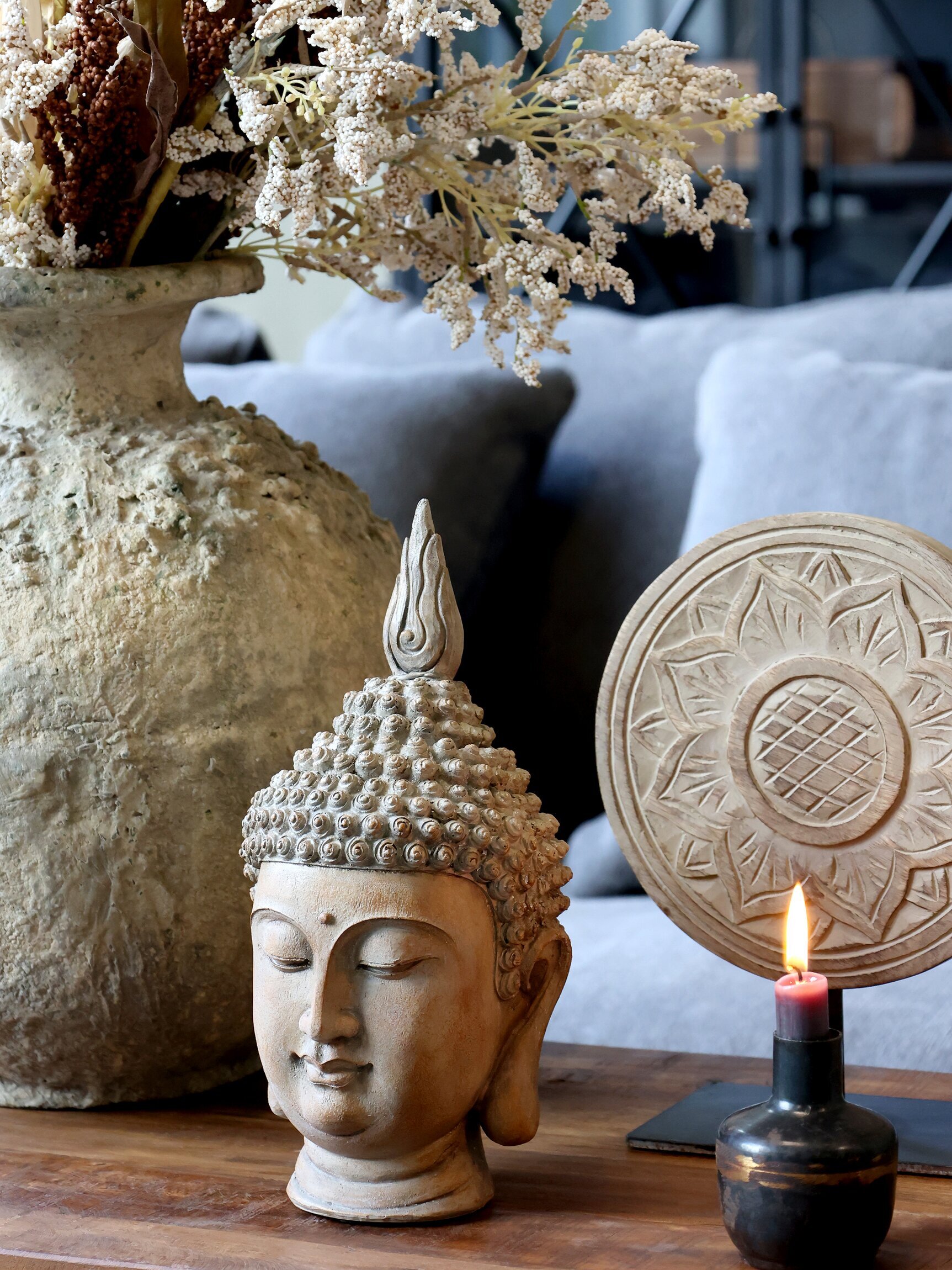 Bilden visar en lugn och harmonisk inredningskrok från butiken Köpstaden.se, där produkten Peaceful Buddha från varumärket Chic Antique står i centrum. I förgrunden ser vi en elegant skulptur av ett Buddhahuvud i naturfärgad keramik. Den har ett rofyllt uttryck och noggrant detaljerat lockigt hår, som graciöst kröns av en låga-liknande spira.