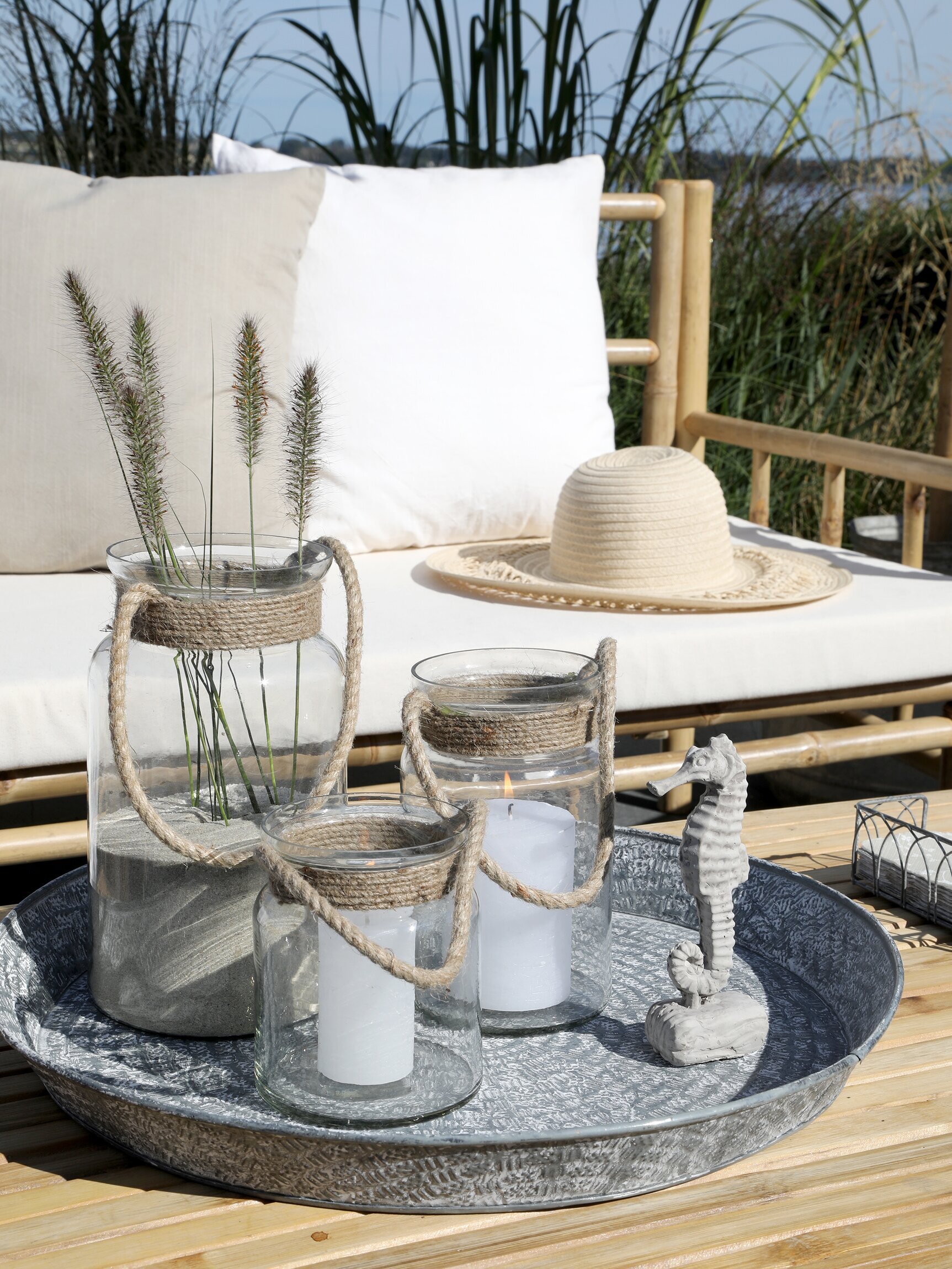 Bilden från Köpstaden.se visar en vackert arrangerad utomhusmiljö med en betoning på naturliga material och avslappnad elegans. Central i bilden är en vacker bricka av metall, prydd med mönster som ger den ett rustikt, men ändå sofistikerat utseende. På brickan står tre glaskärl av varierande storlek, och dessa är försedda med tjocka rep kring halsen som fungerar som handtag. Två av kärlen innehåller vita blockljus vars enkla design harmonierar med resten av arrangemanget. Det tredje kärlet innehåller sand och dekorativa växter, vilket skapar en harmonisk balans mellan de olika elementen.