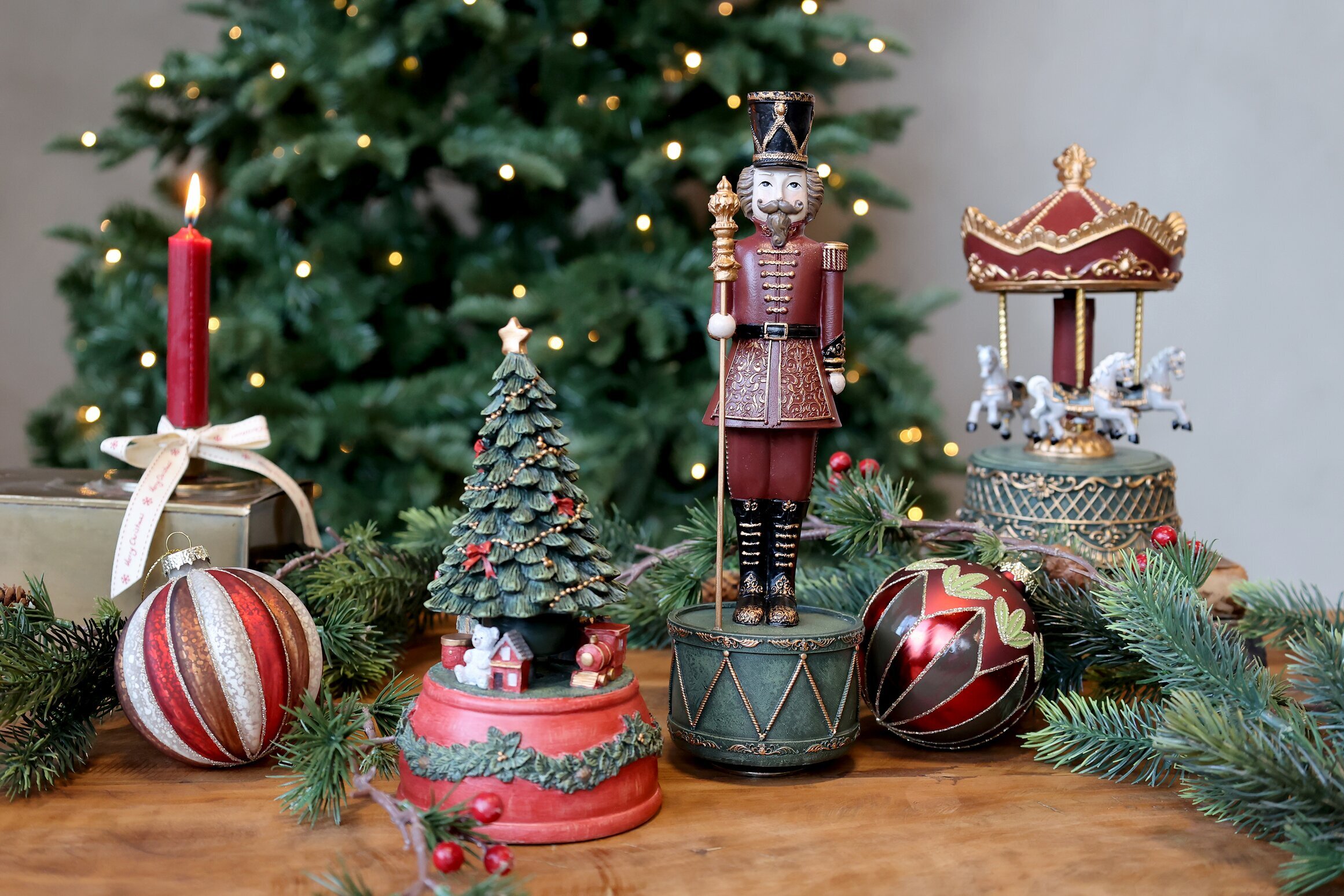 En charmig speldosa i form av en julgran, vackert dekorerad med röda rosetter, guldkedja och små julklappar vid foten. När du vrider upp den spelas den klassiska julsången Jingle Bells, vilket sprider härlig julstämning i hemmet.