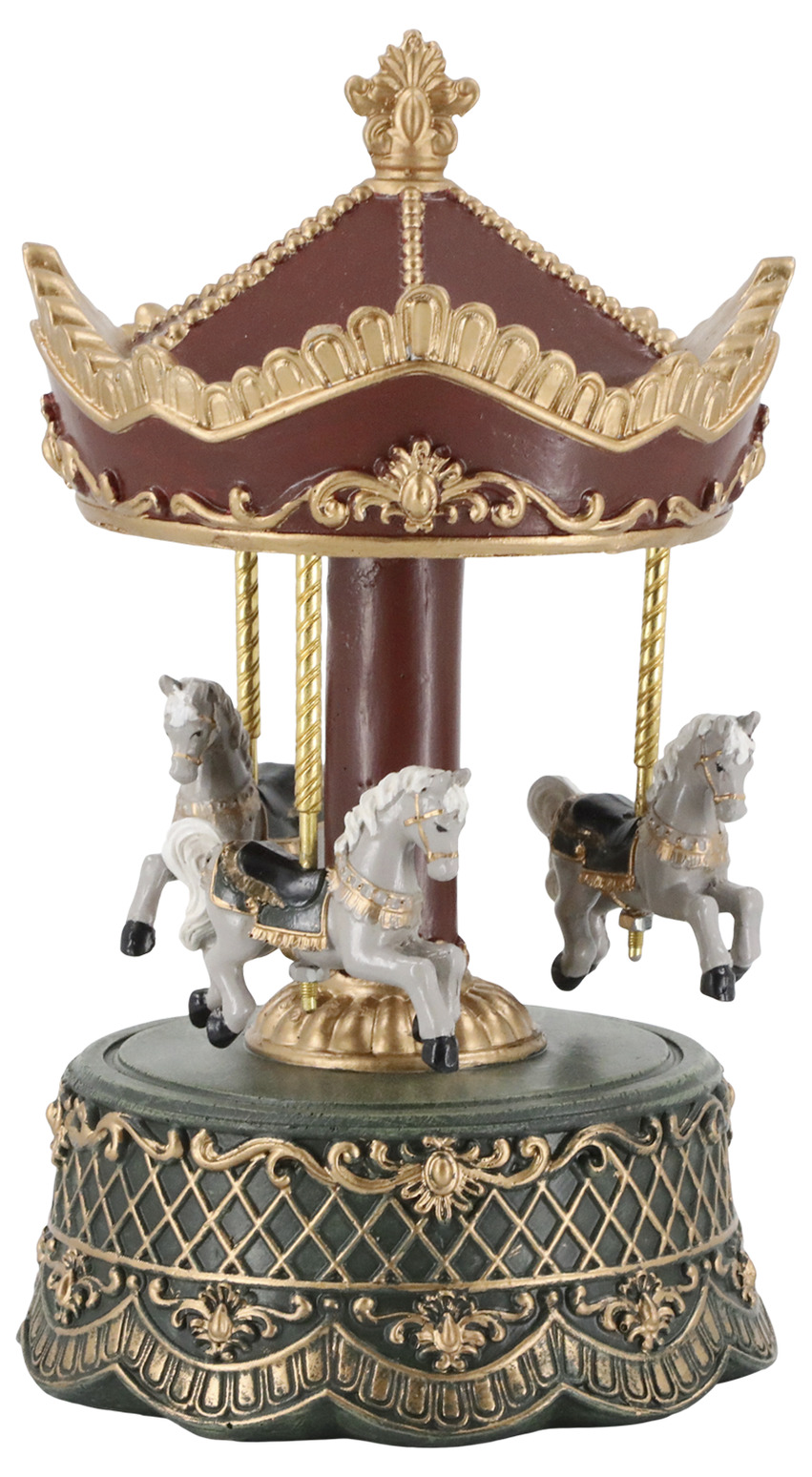 En charmig speldosa i klassisk karusell-design med vackra detaljer i rött, grönt och guld. När du vrider upp den börjar hästarna snurra runt samtidigt som den spelar den välkända julsången "Jingle Bells".