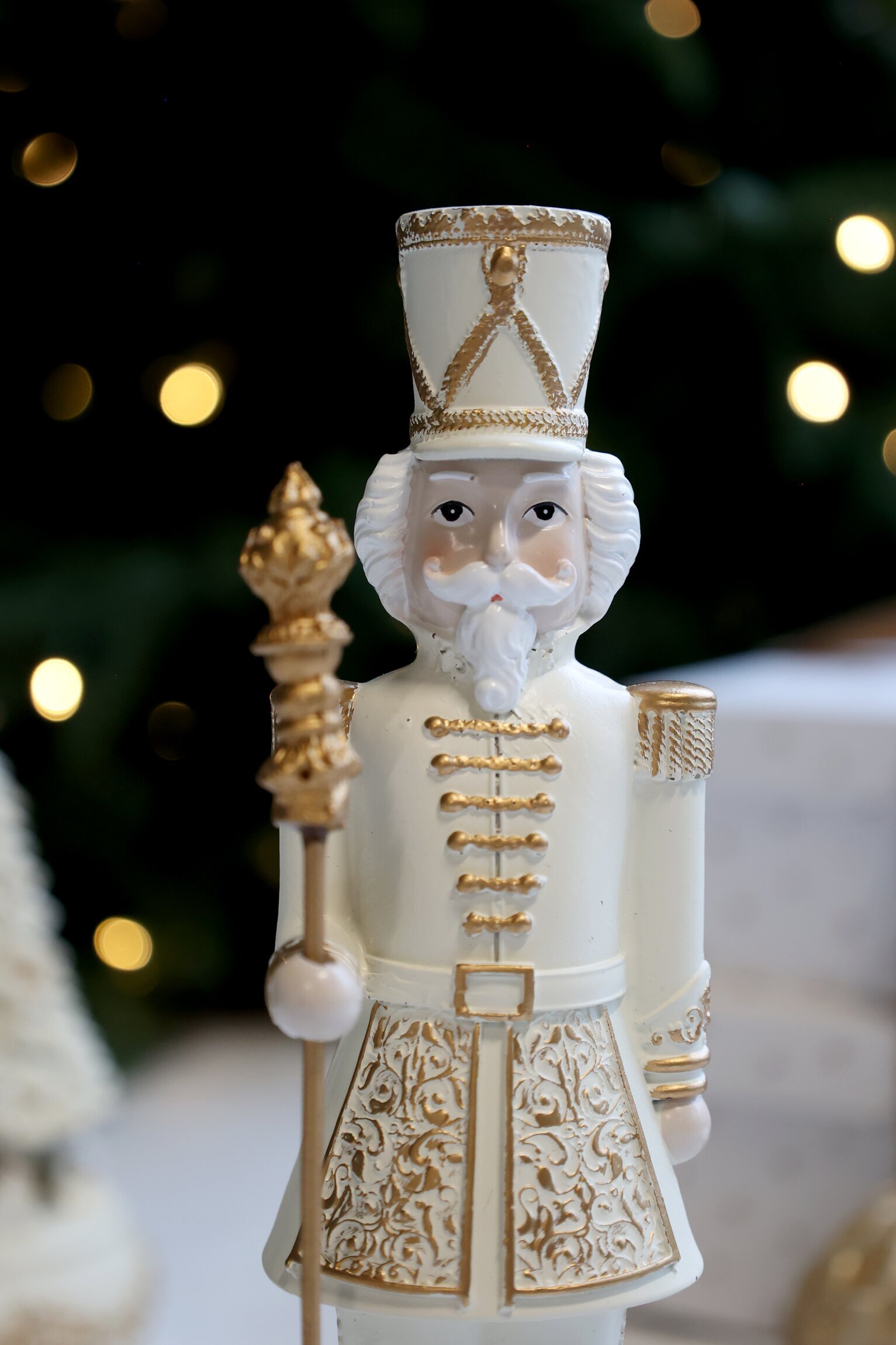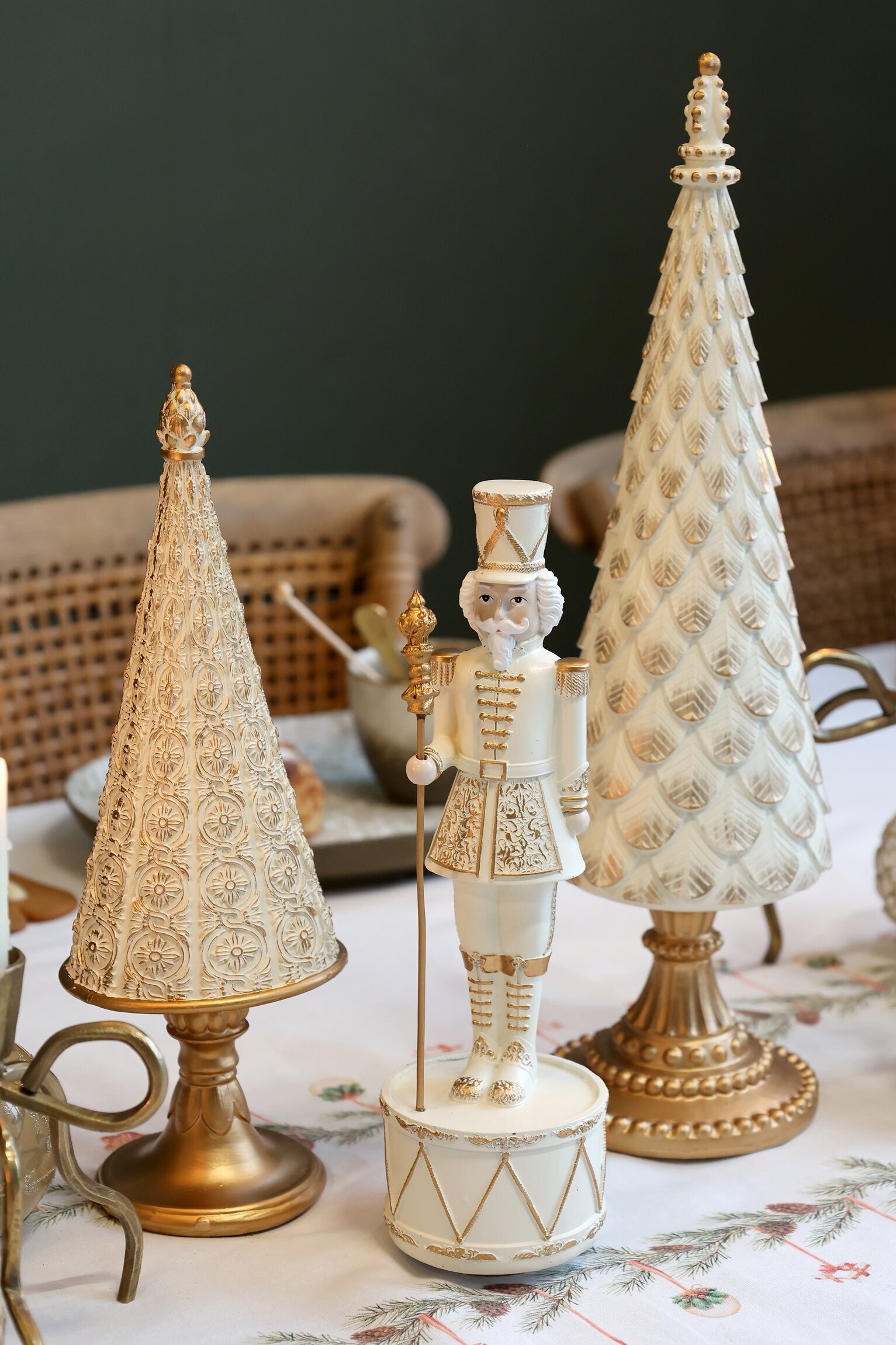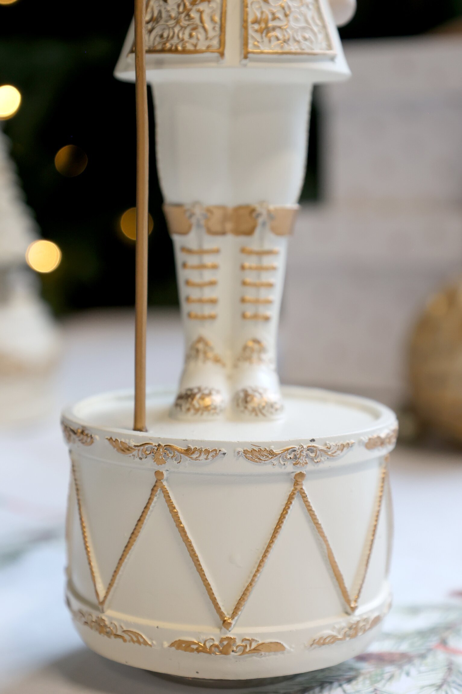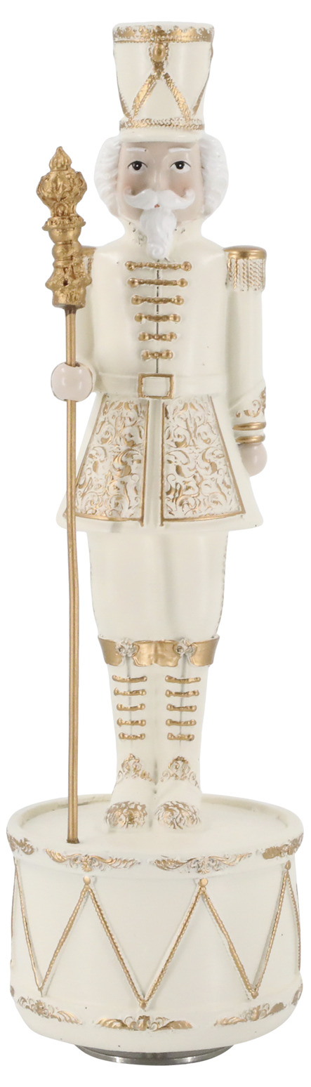 En klassisk speldosa i form av en stående trumslagare, vackert klädd i vitt med gulddetaljer. Figuren står på en trumma och är rikt dekorerad med fina mönster och detaljer som för tankarna till julens traditioner.