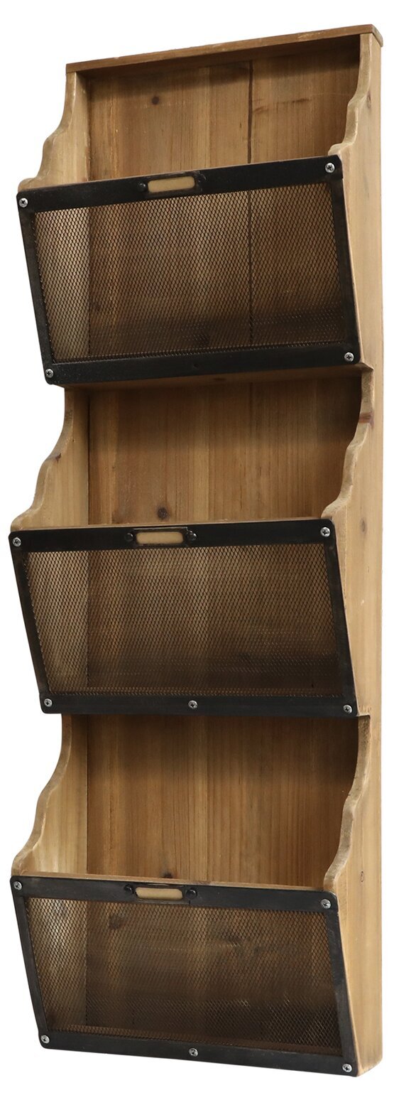 Bilden visar ett väggmonterat tidningsställ från varumärket Chic Antique, tillgängligt hos Köpstaden.se. Stället har en rustik och funktionell design, vilket gör det både praktiskt och dekorativt för hemmet. Konstruktionen består av tre separata fack inbyggda i en ram av trä och metall, som ger en distinkt och robust känsla. Träets naturliga ådring är synlig och ger en varm, organisk känsla, medan metallnätet på de svarta facken ger konstruktionen en industriell touch.