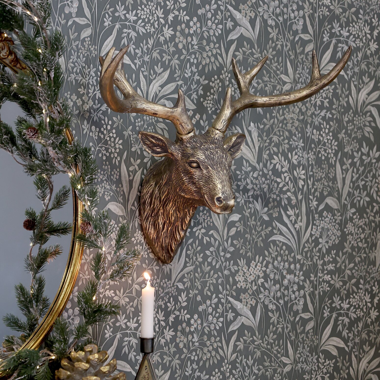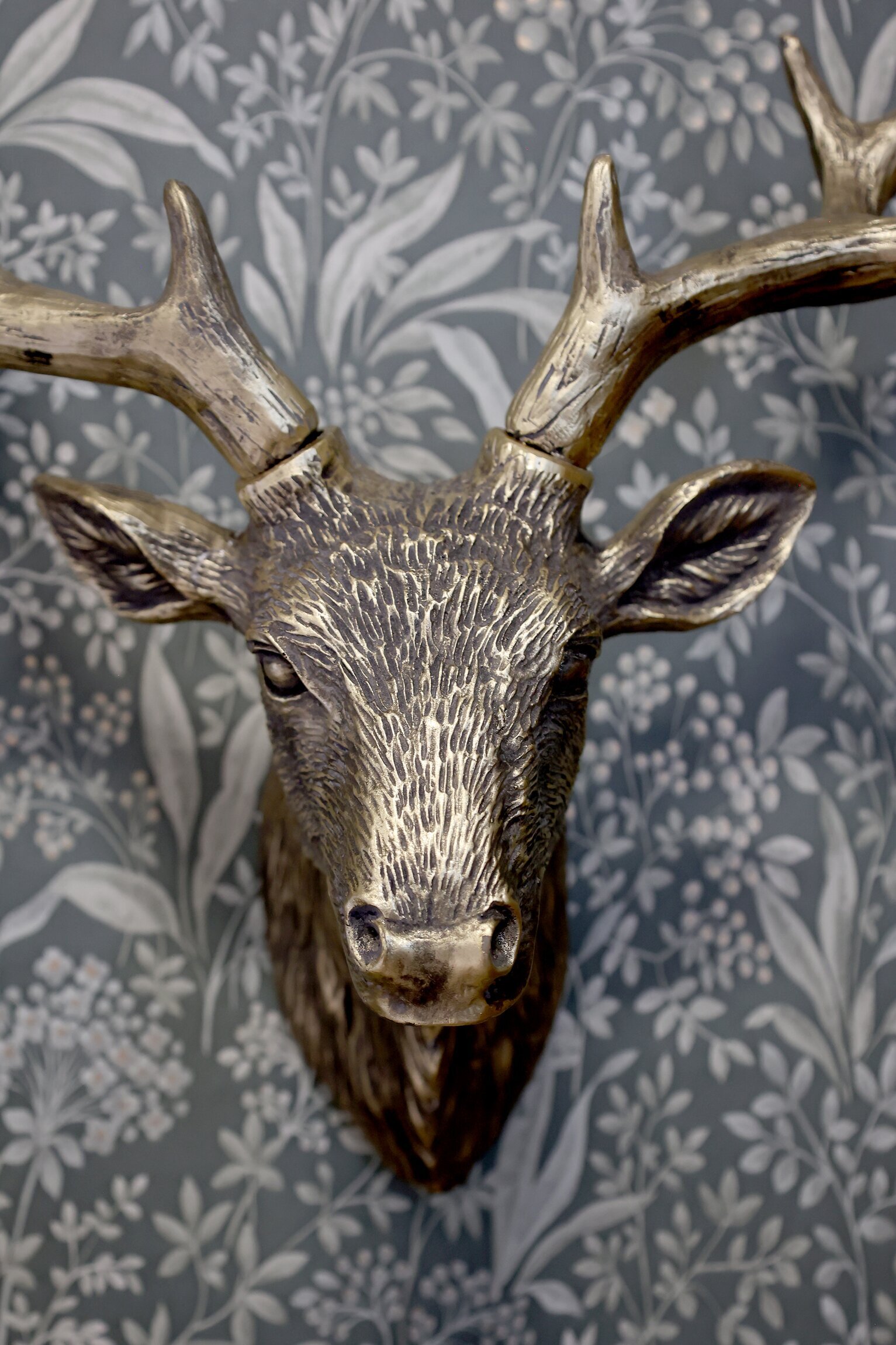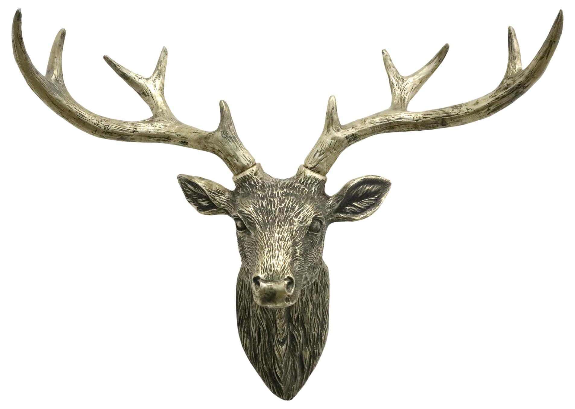 Skapa en stämningsfull och elegant atmosfär i hemmet med detta dekorativa hjorthuvud i antik guldfinish. Den detaljerade designen med realistiska horn och naturtrogna strukturer ger en rustik känsla med en lyxig touch.