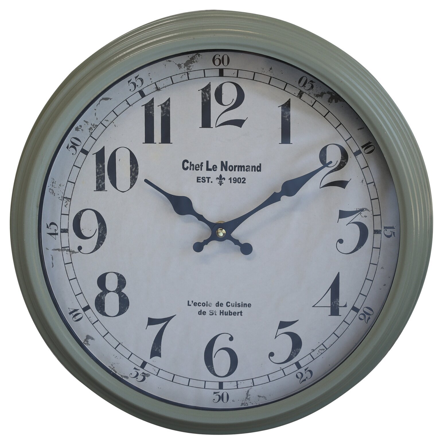 Väggklocka i en fin grön nyans med slitna detaljer för att få fram ett antikt utseende, från Chic Antique.