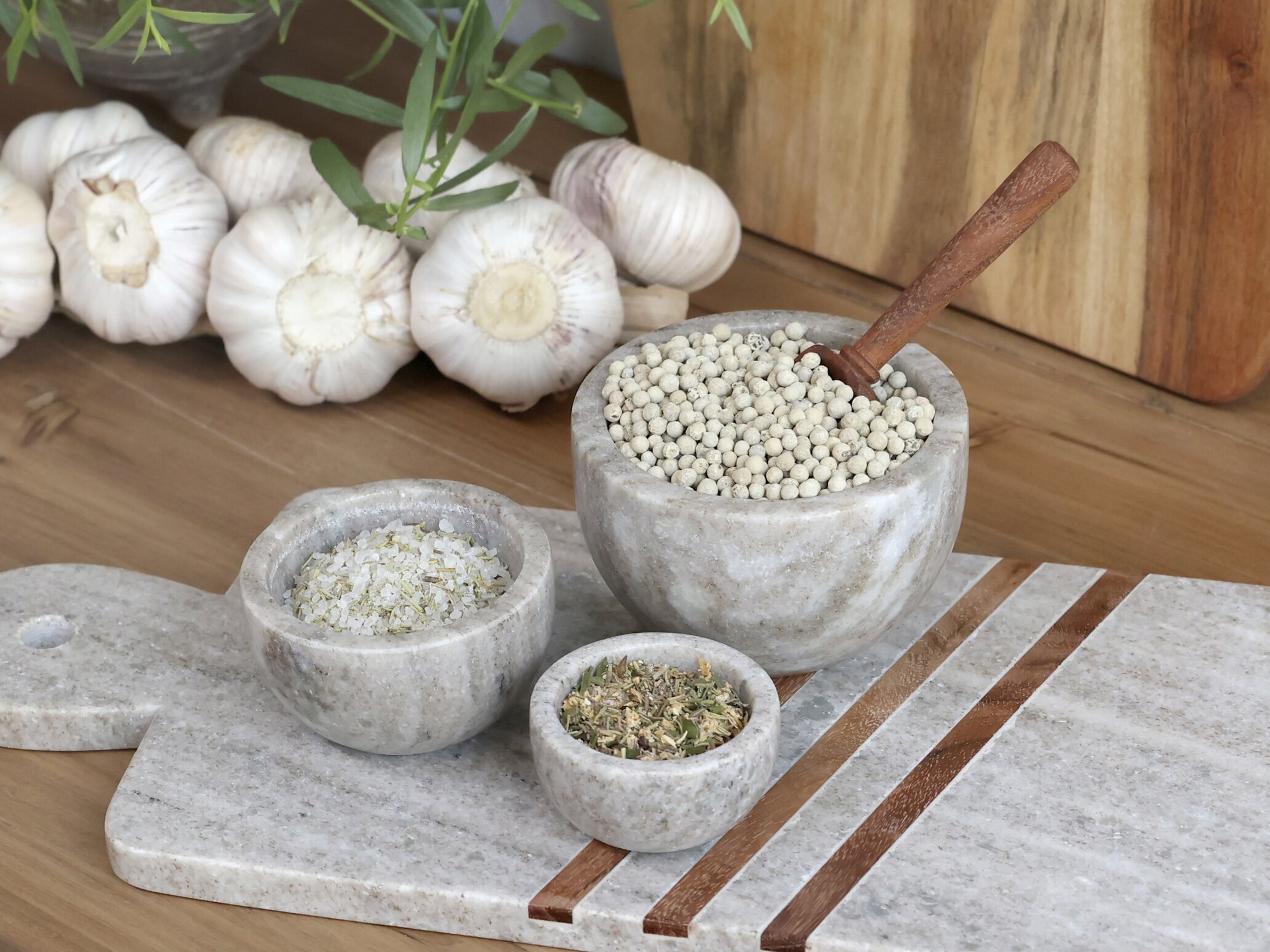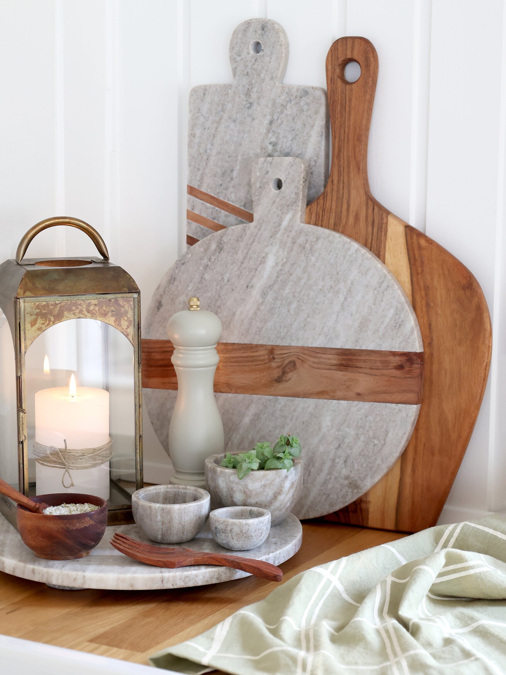 Dekorativ sked i akacia som passar fint tillsammans med marmorskålarna på det dukade bordet. Från Chic Antique. Läs mer