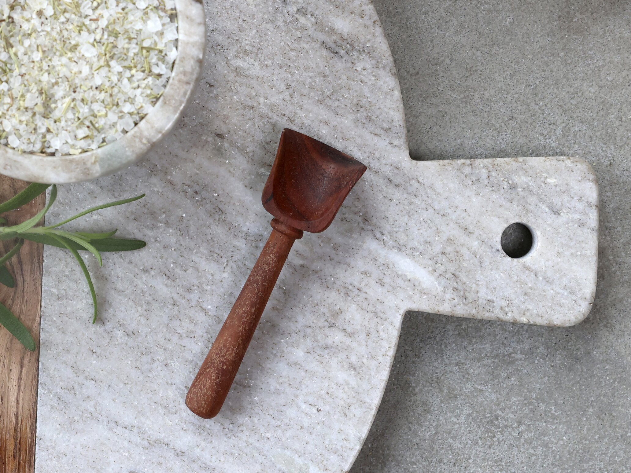 Dekorativ sked i akacia som passar fint tillsammans med marmorskålarna på det dukade bordet. Från Chic Antique.