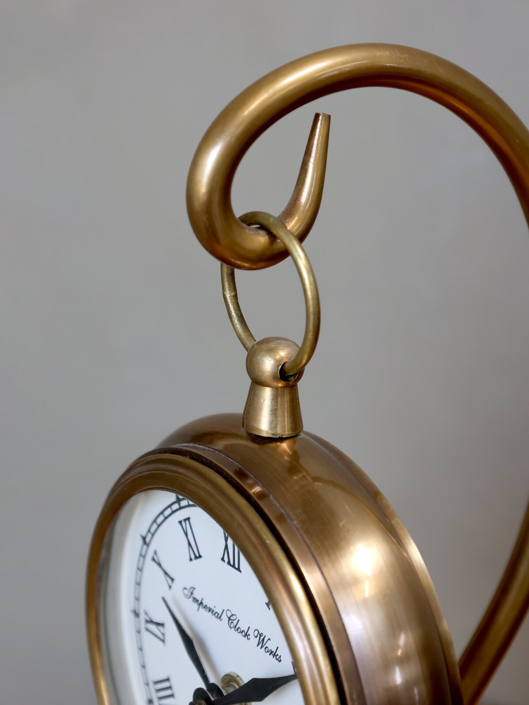 Bilden visar en del av en produkt från Köpstaden.se, närmare bestämt en klocka på fot i mässing tillverkad av varumärket Chic Antique. Fokus i bilden ligger på klockans överdel, där den eleganta böjda kroken av mässing framträder tydligt. Denna krok, formad som ett inverterat U, utgör en förbindelsepunkt mellan själva klockan och dess fot, vilket ger ett visuellt flöde som drar blicken mot klockans urtavla.