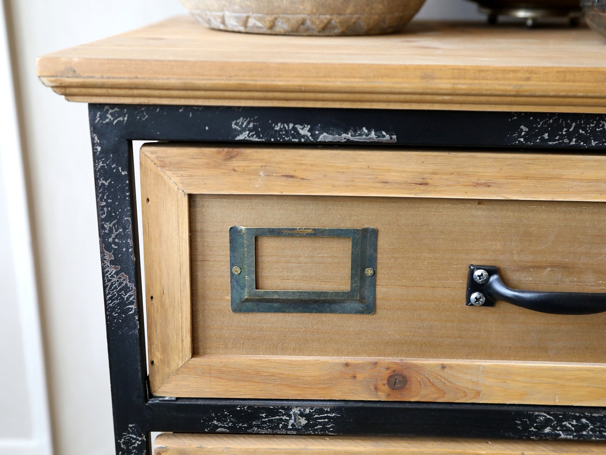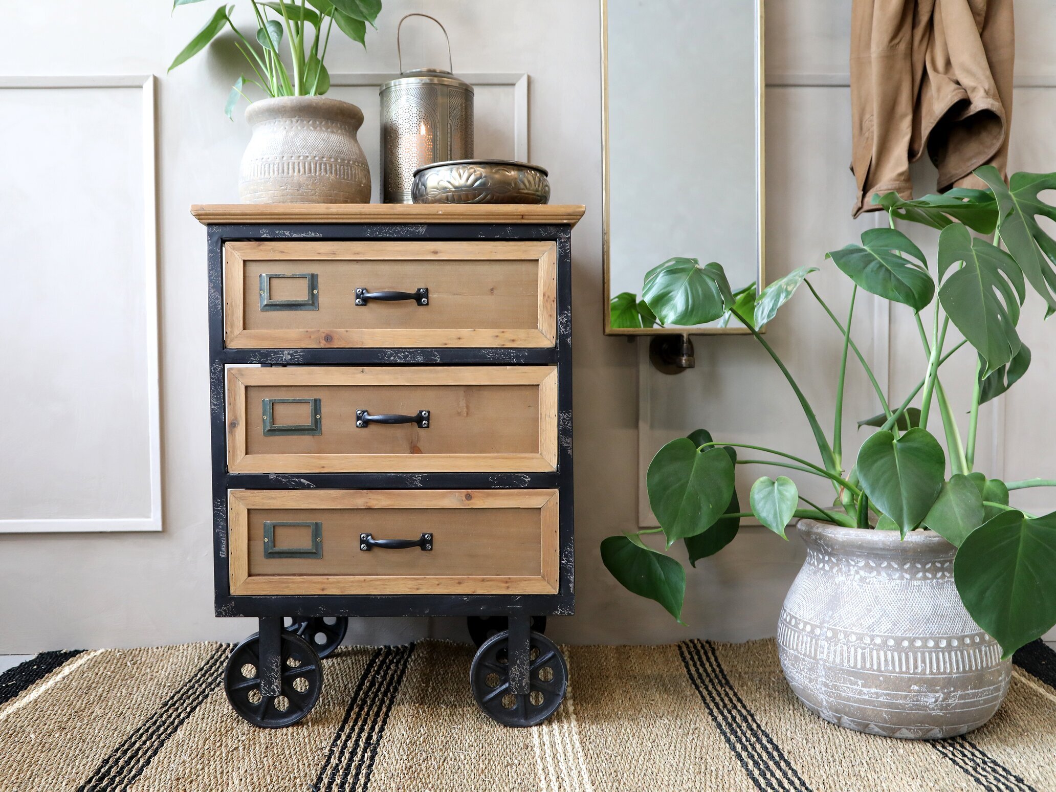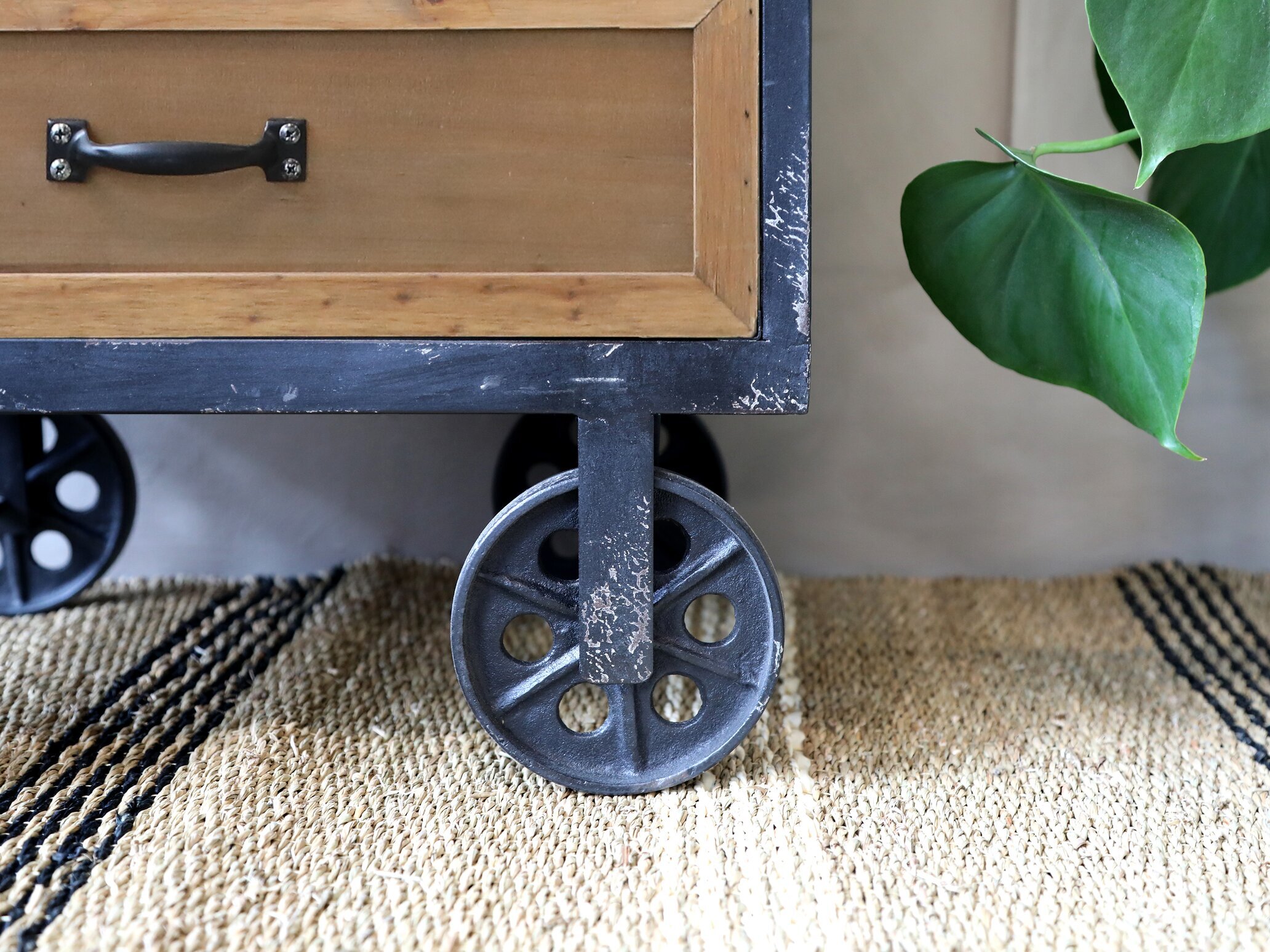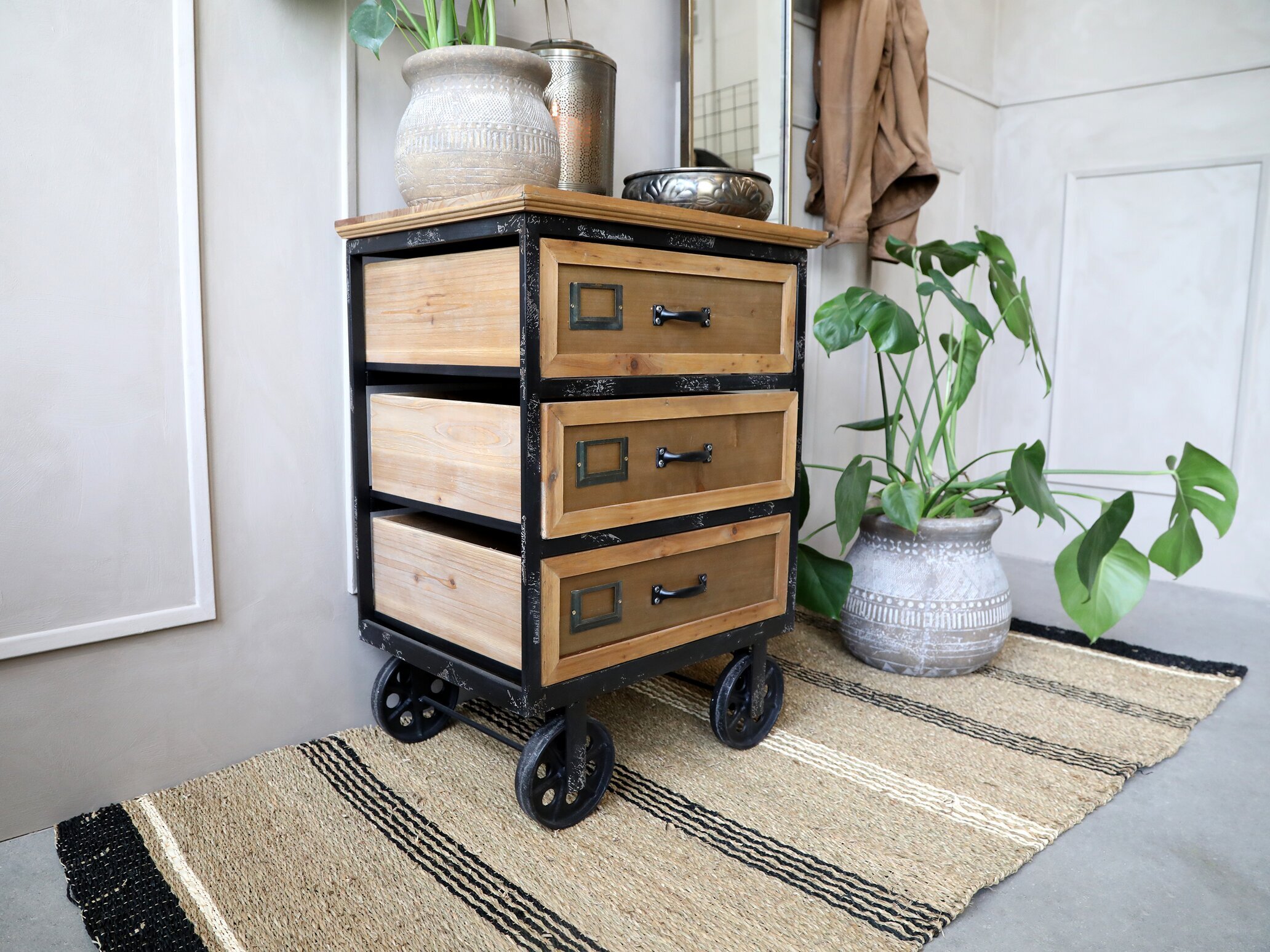 Byrå på hjul med 3 lådor försedda med järnhandtag, fin att använda både i kök, hall & vardagsrum. Läs mer