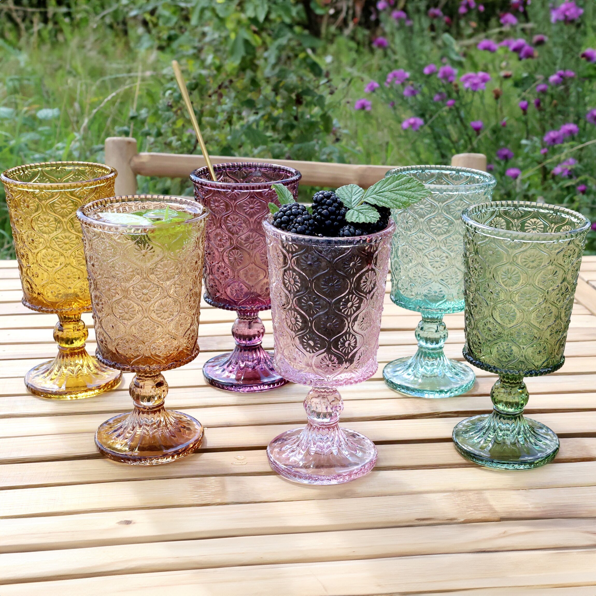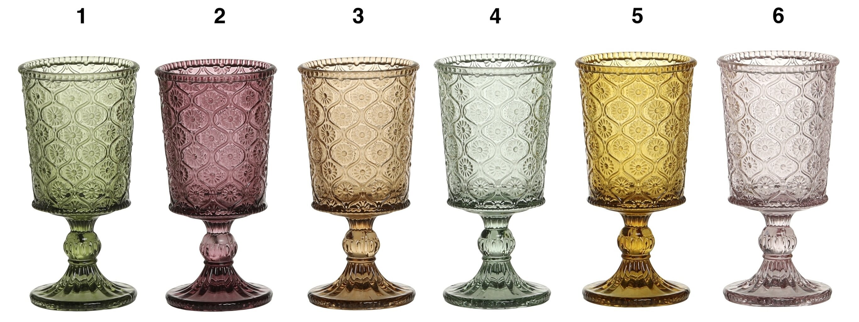 Vackra vinglas med mönster, finns i flera olika färger fina att mixa & matcha. Från Chic Antique.
