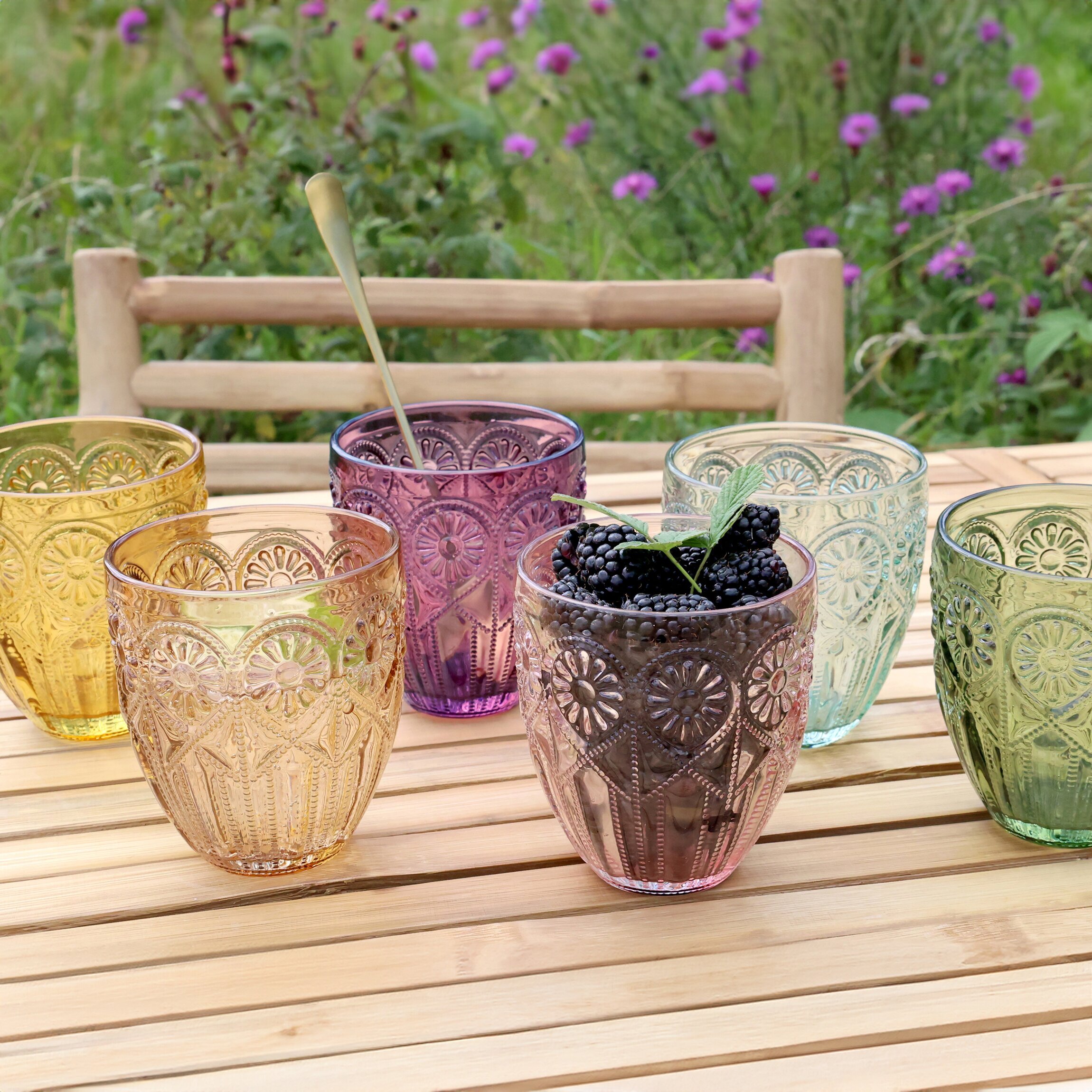 Vackra dricksglas med mönster, finns i flera olika färger fina att mixa & matcha. Från Chic Antique. Läs mer