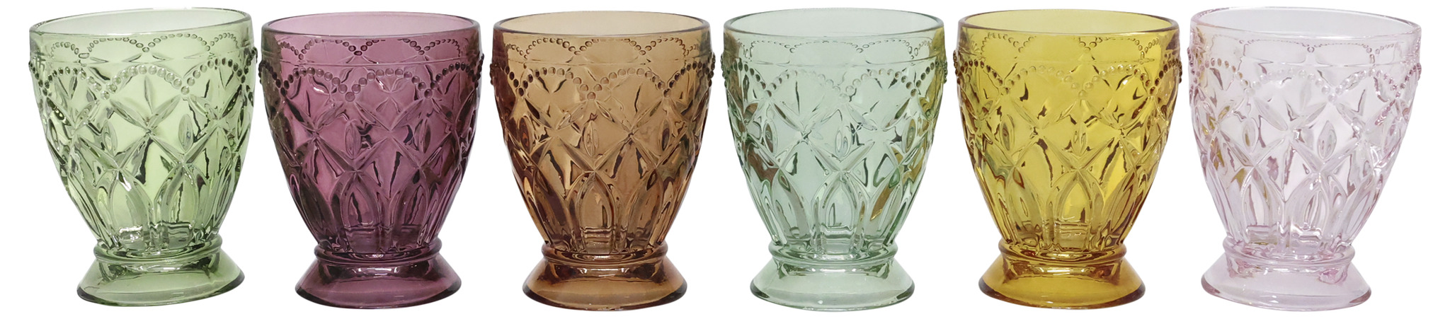 Färgglada glas med vacker relief – en touch av elegans till varje dukning, från Chic Antique. Läs mer