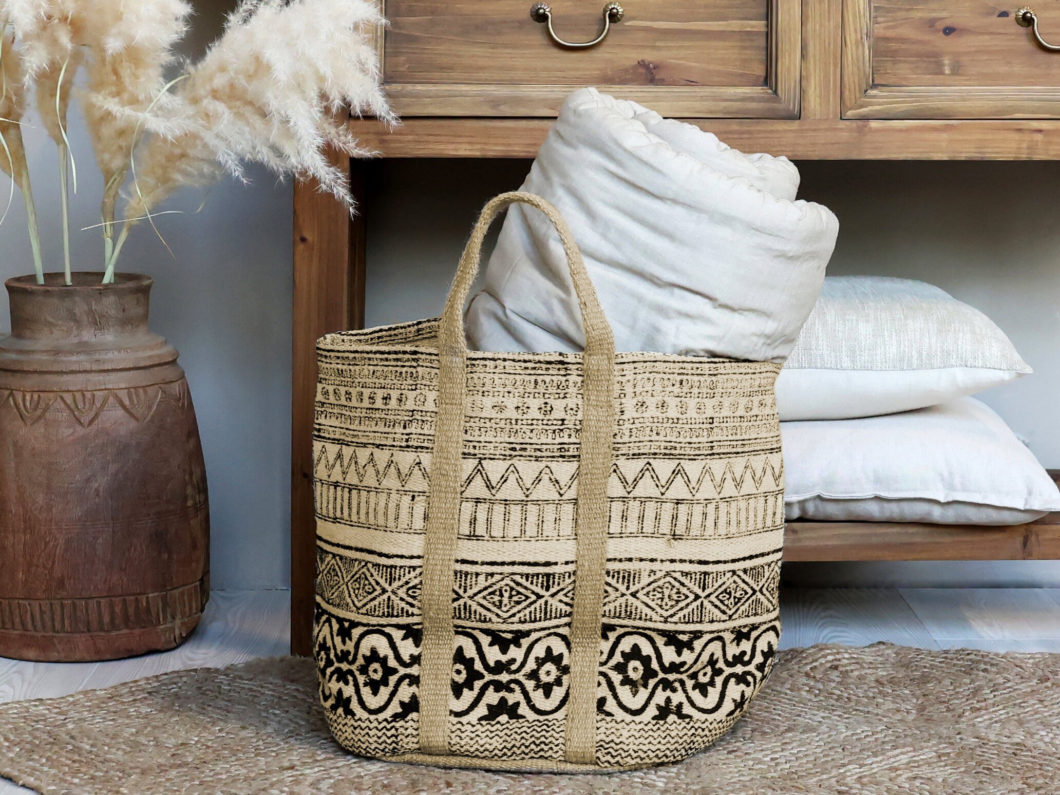 Förvaringskorg med handtag tillverkad i jute, en fin detalj till förvaring i hemmet. Från Chic Antique.