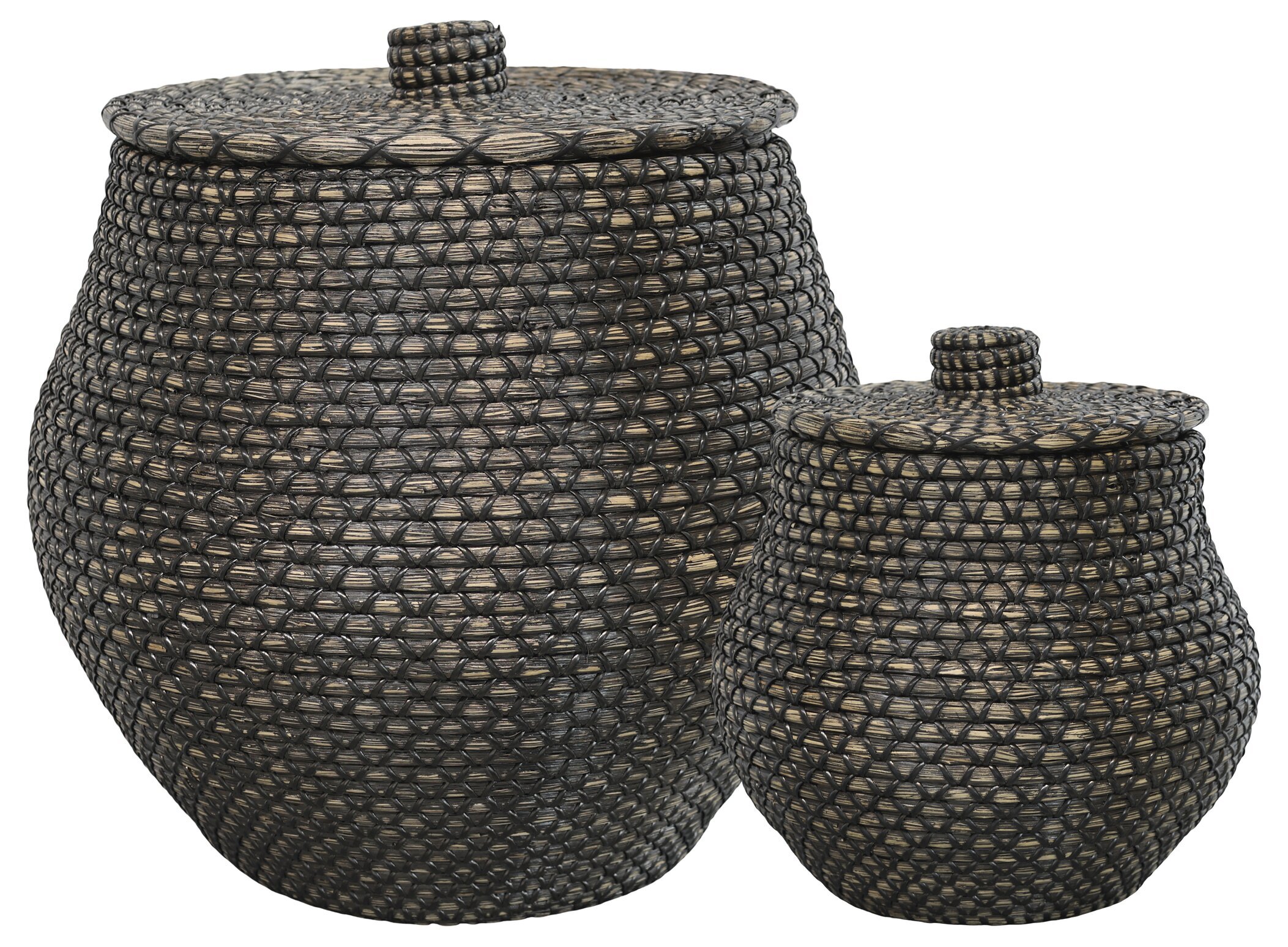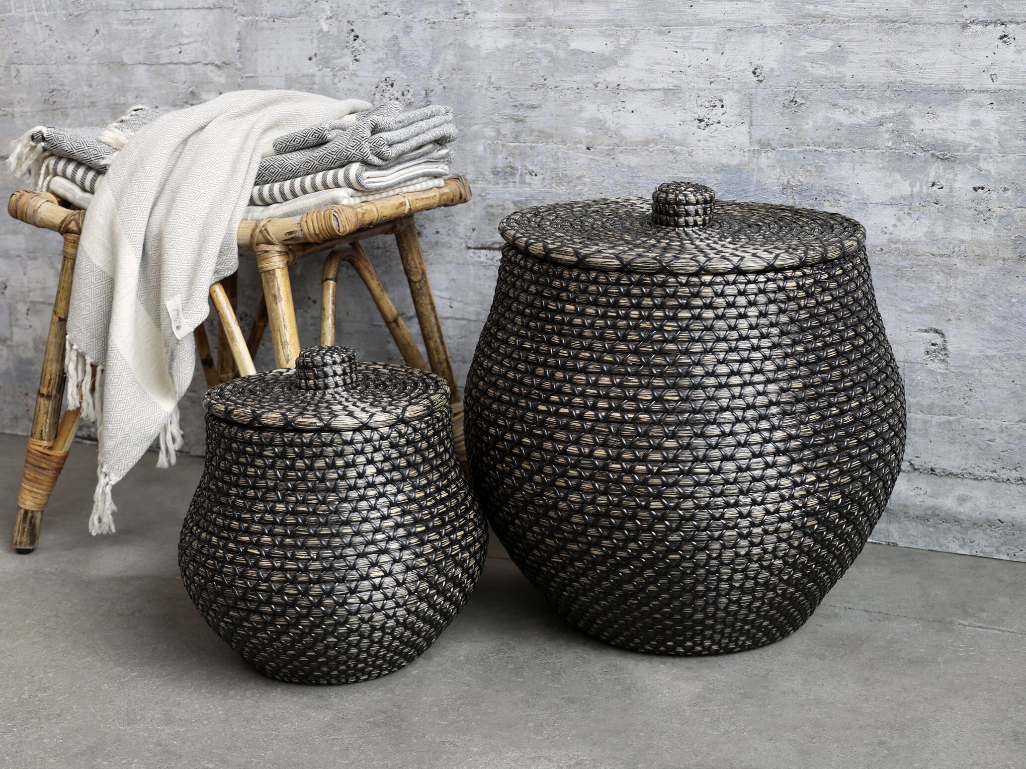 Förvaringskorg tillverkad i sjögräs med mörka dekorativa band samt lock med knopp. Korgen kan bl a användas till förvaring av tvätt, leksaker eller handdukar i badrummet. En vacker dekorativ korg som gör sig fint i husets alla rum.