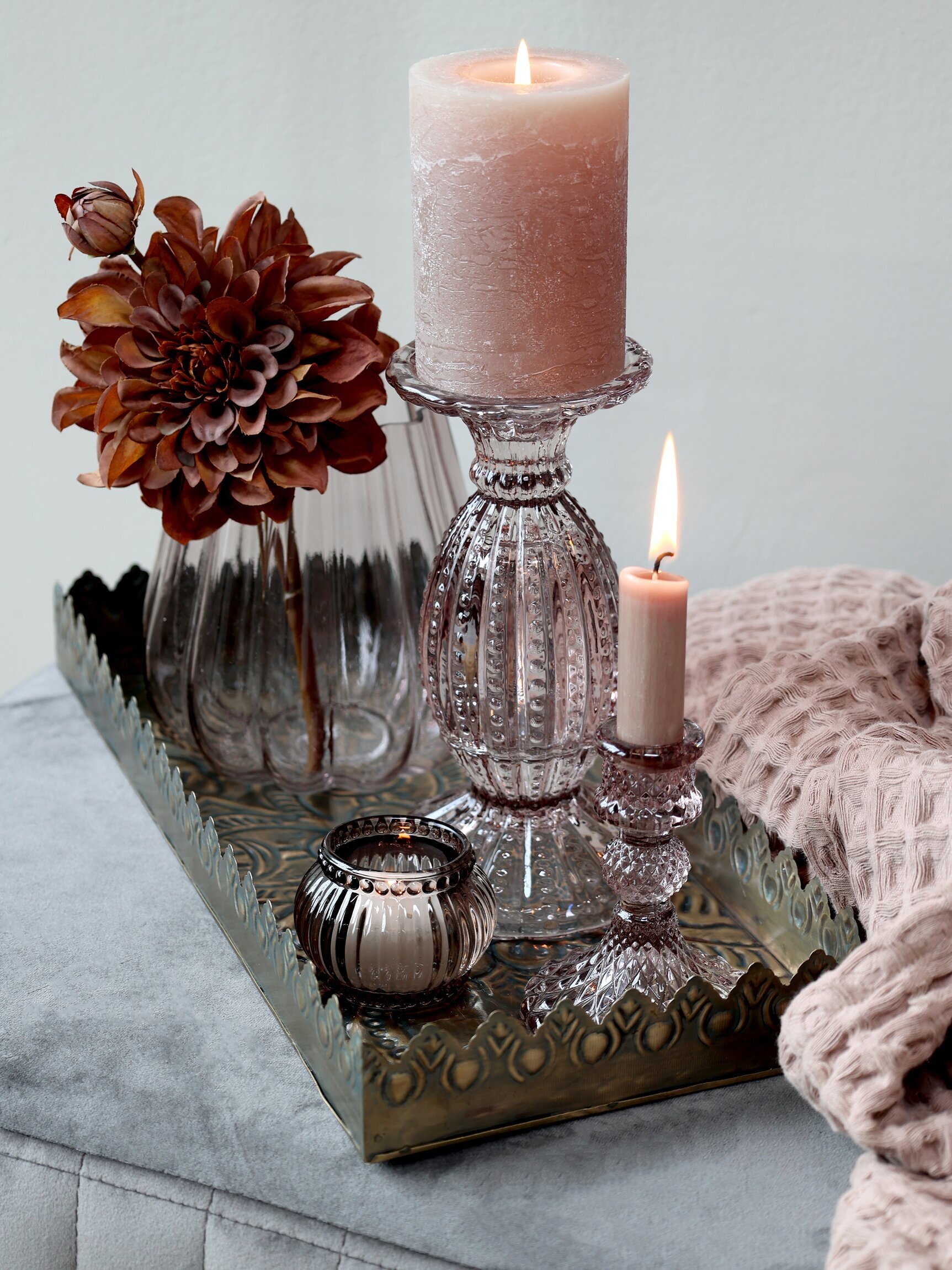 På det största av faten står en generöst tilltagen blockljus av ljusrosa nyans. Ljuset ger ett mjukt sken som reflekteras mot de omliggande ytorna. Ljushållarna är av glas med fina detaljer och räfflade ytor, som förstärker ljusets glöd och kompletterar mässingens varma ton.