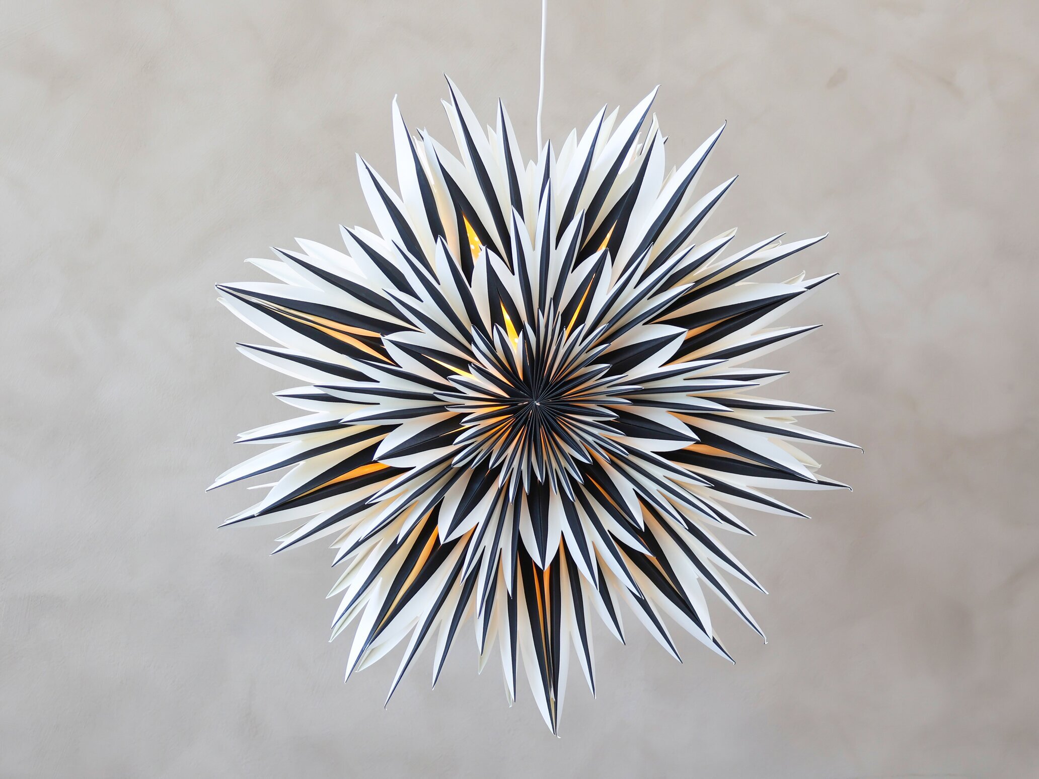 Bakgrunden är neutral med en mjuk, beige ton som skänker lugn och låter själva adventsstjärnan stå i centrum utan distraktioner. Denna avskalade bakgrund bidrar till att framhäva stjärnans lekfulla och distinkta former, vilket gör det lätt för den att bli huvudfokuset i vilket utrymme den än placeras i.