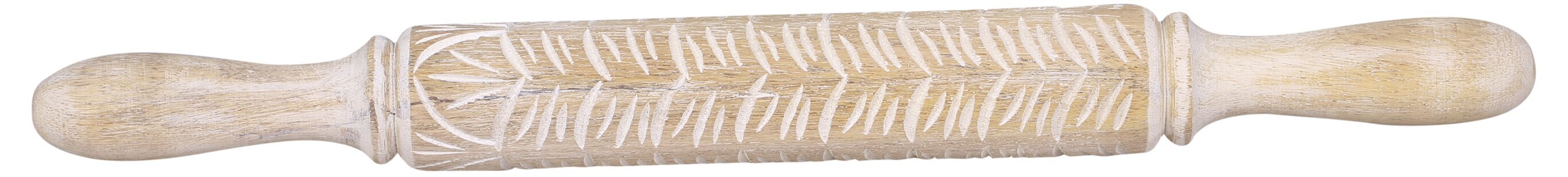 Bilden visar en kavel med ett dekorativt mönster, en produkt som finns tillgänglig hos Köpstaden.se och är en del av sortimentet från varumärket Chic Antique. Kavlen är gjord av ljust trä, vilket ger den ett naturligt och traditionellt utseende. Ytan är prydd med ett intrikat mönster som är snidat in i träet. Detta mönster består av återkommande linjära detaljer och lövmotiv, som ger en tydlig känsla av hantverk och omsorgsfull design.